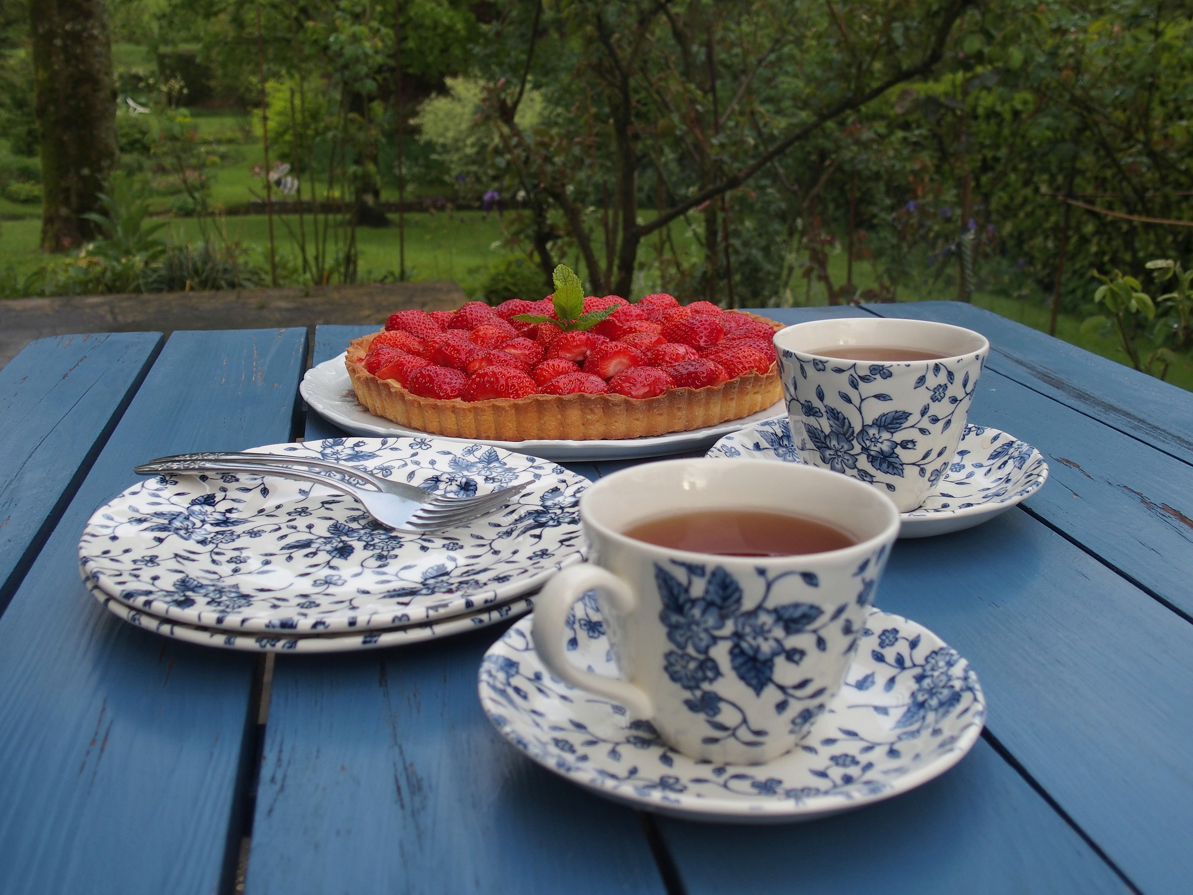 Finalement la pluie a cessé et la douceur de l’air nous a permis de déguster au jardin cet accord parfait de pâte sablée, de crème pâtissière et fraises parfumées …