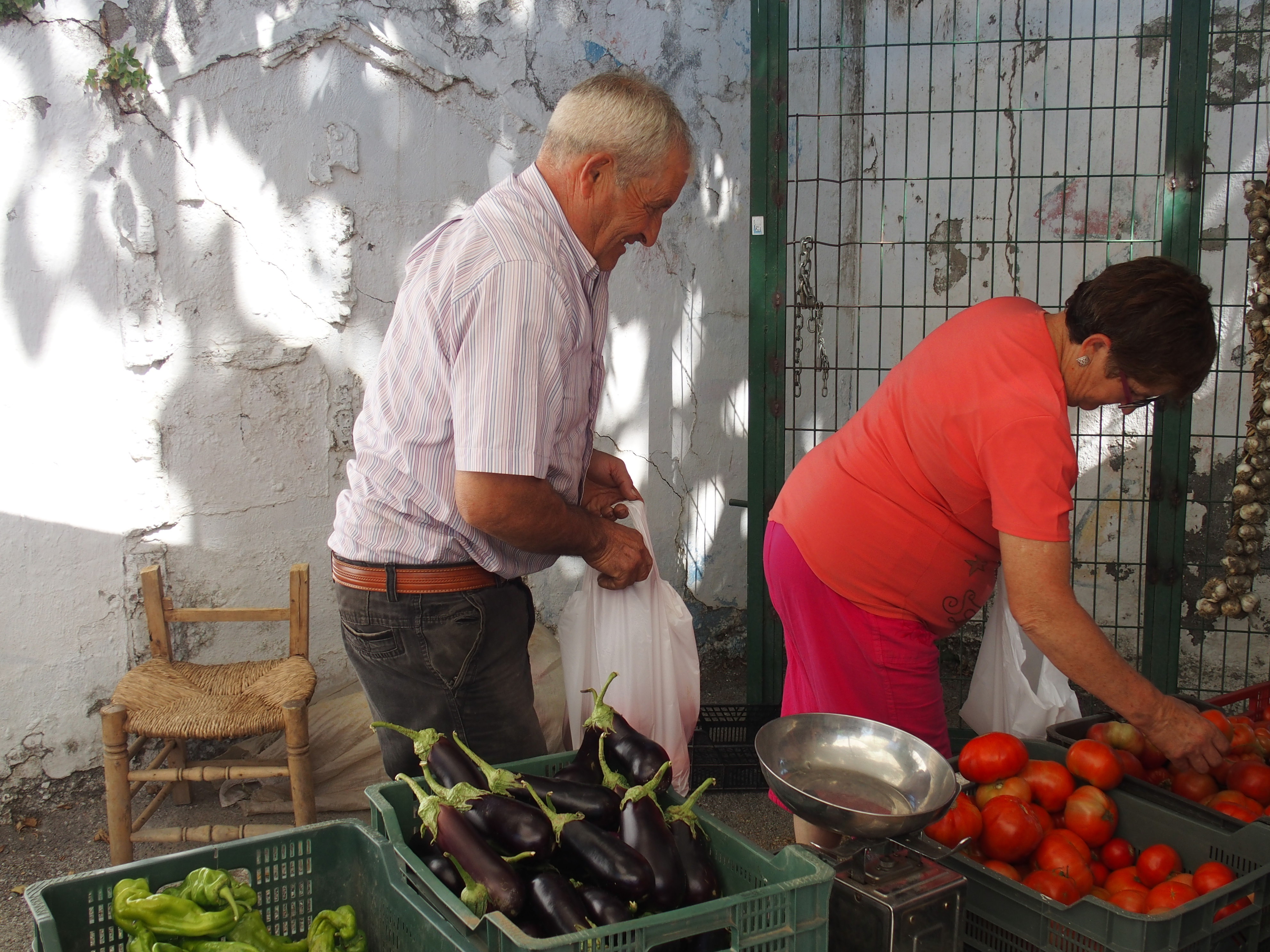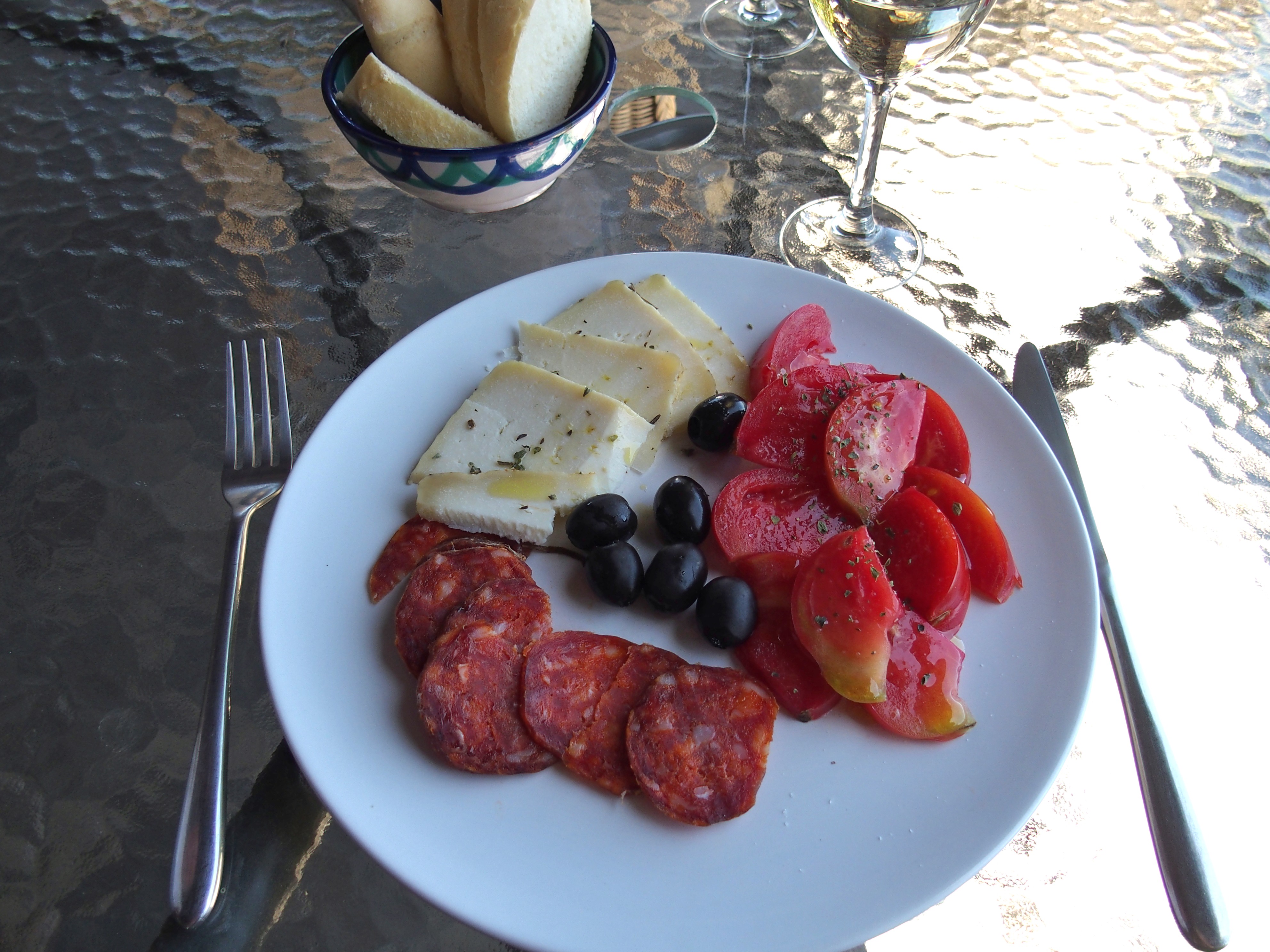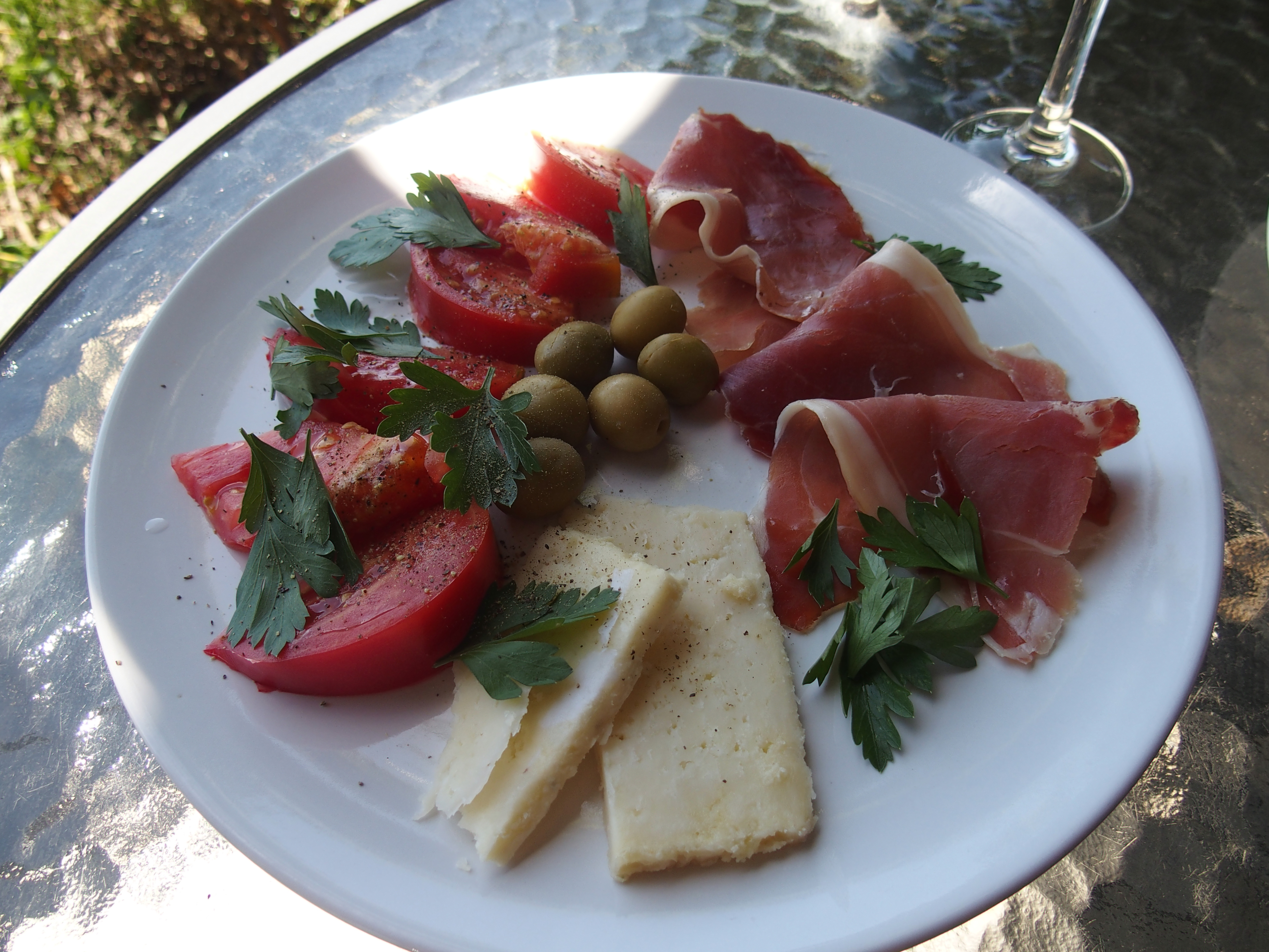 Jambon de Trevelez (celui de Juan, notre voisin), fromage de brebis, chorizo, tomates de jardin, huile d’olive et pain frais. Le tout arrosé de vin rouge ou blanc selon notre envie du moment.