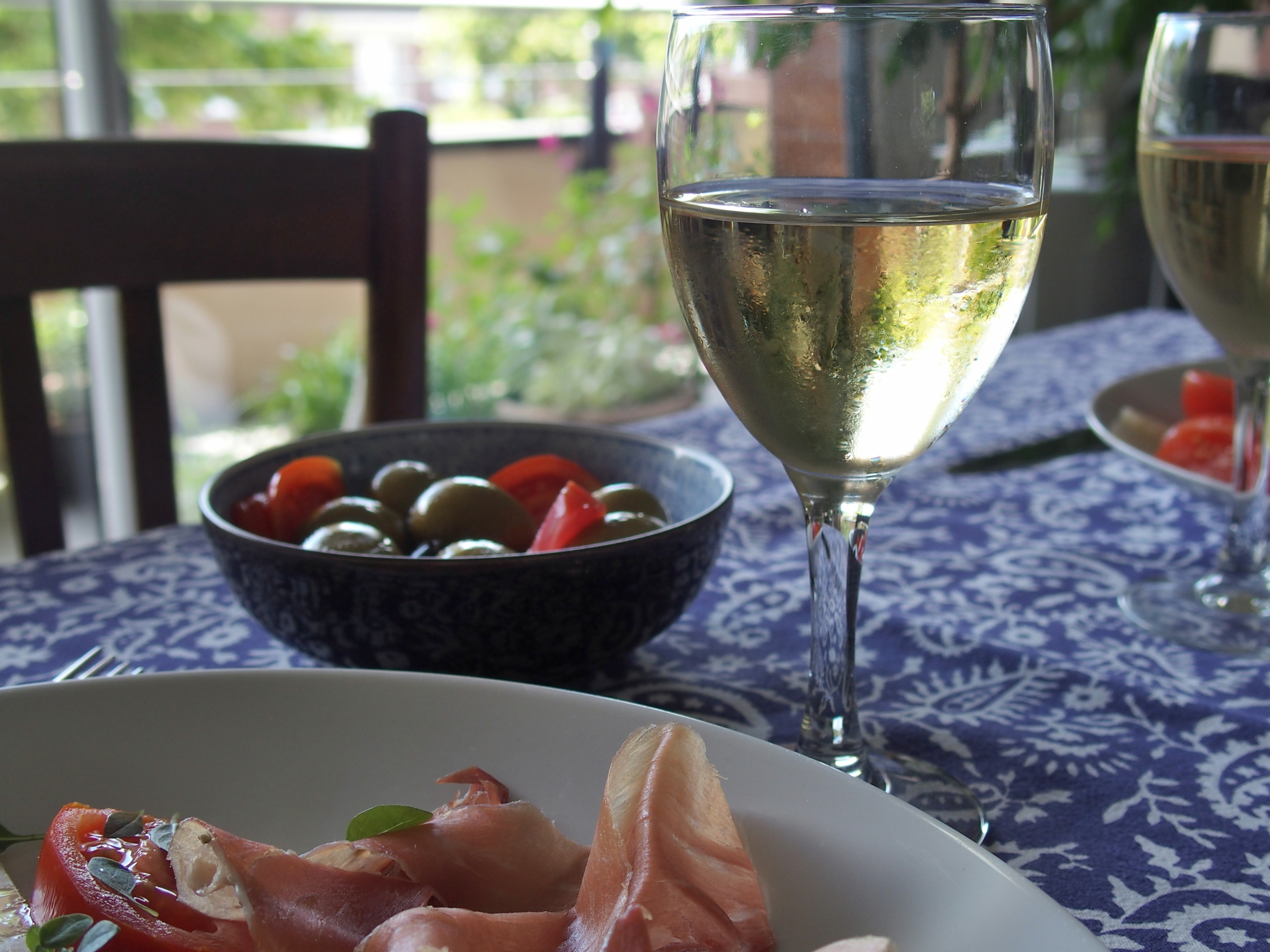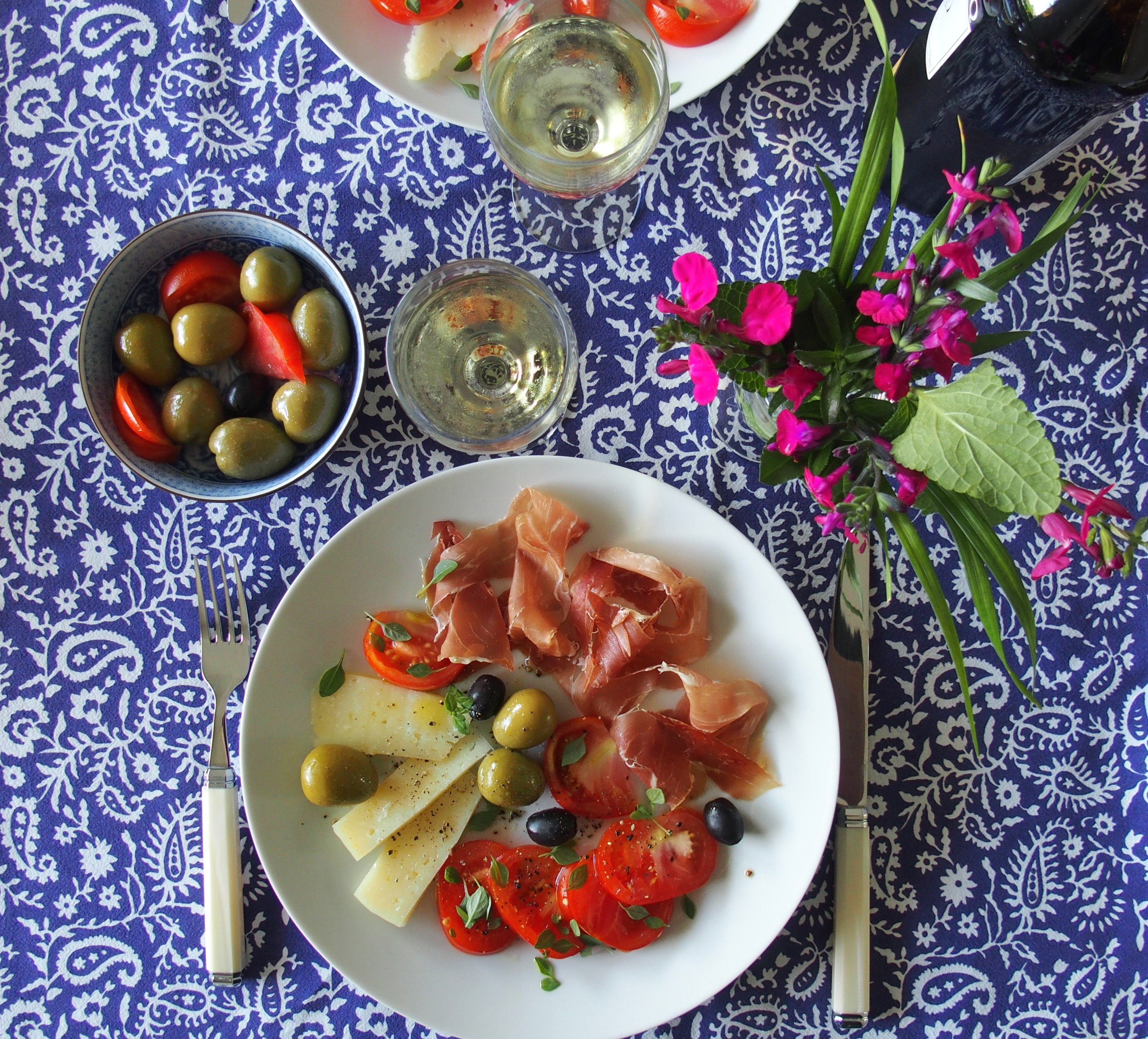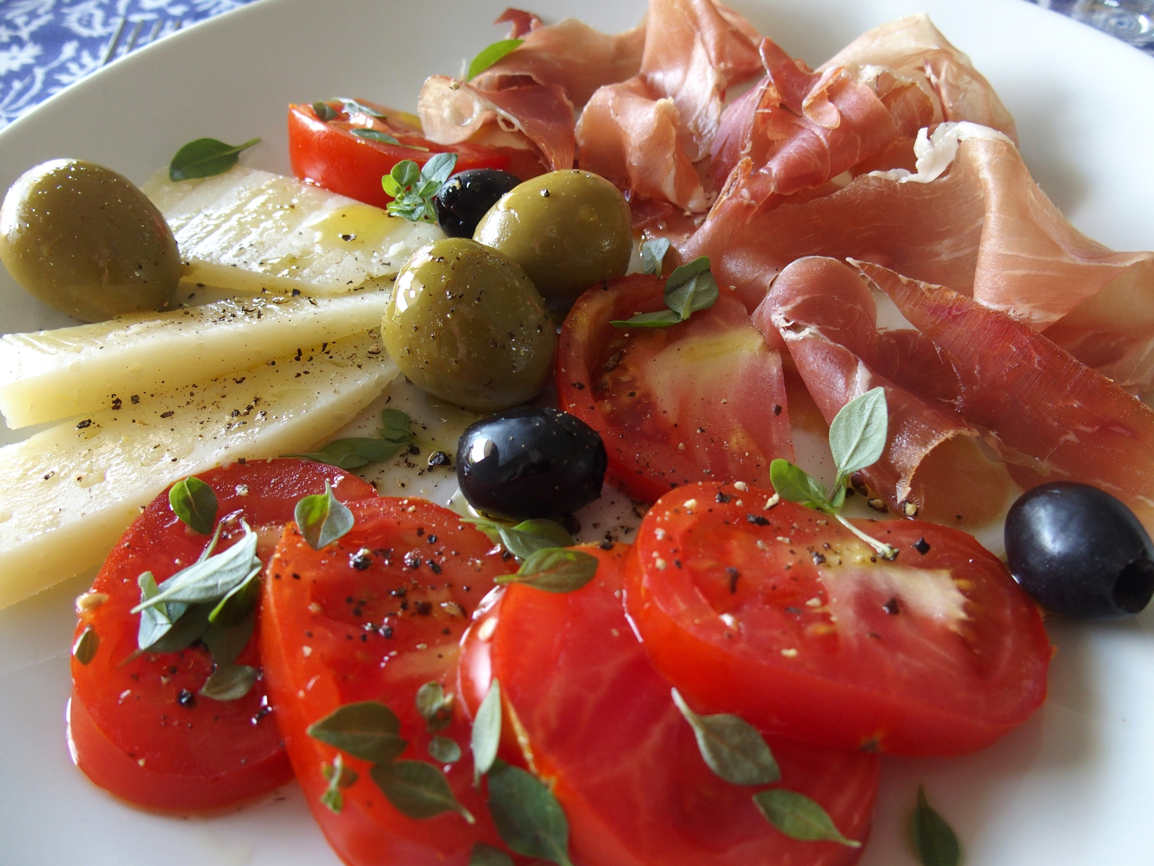 Jambon de Trevelez (celui de Juan, notre voisin), fromage de brebis, chorizo, tomates de jardin, huile d’olive et pain frais. Le tout arrosé de vin rouge ou blanc selon notre envie du moment.