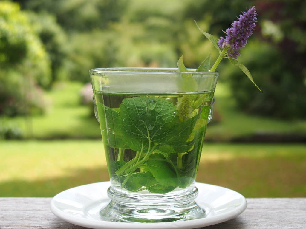 Ici, une infusion d’agastache bleue (une explosion d’anis frais sur le palais !) aux propriétés digestives et utilisée également contre les rhumes.