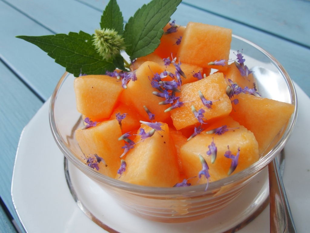 Et une coupe de melon simplement aromatisée aux fleurs d’agastache. J’adore la complémentarité du bel orange et du bleu mauve. C’est beau et bon.