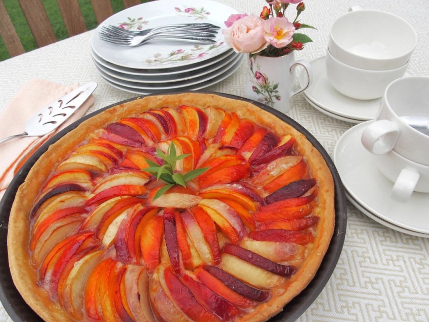 J‘aime les rituels sucrés qui rythment l’année et nous rappellent, beaucoup mieux que le calendrier, l’enchaînement des saisons : tarte aux mirabelles en automne, gâteau aux pommes, sablés à la cannelle et chocolat chaud en hiver … mais bon, nous n’en sommes pas encore là ! Pour l’heure, c’est encore l’été – enfin, par intermittence, car le nord s’obstine cette année à ressembler à sa caricature de contrée polaire noyée sous la pluie – et je peux encore et encore régaler les gourmands avec ma tarte pêches-brugnons.