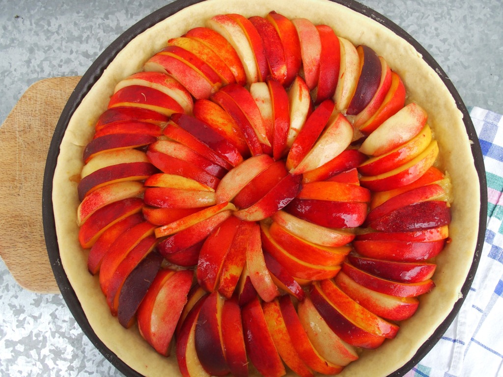 4/ Montage et cuisson : étaler le mélange amandes-citrons sur le fond de tarte précuit. Recouvrir avec les fruits en quartiers – en alternant les pêches et les nectarines (pour obtenir un joli mélange de couleurs !). Saupoudrer de sucre roux et mettre 30 mn au four.