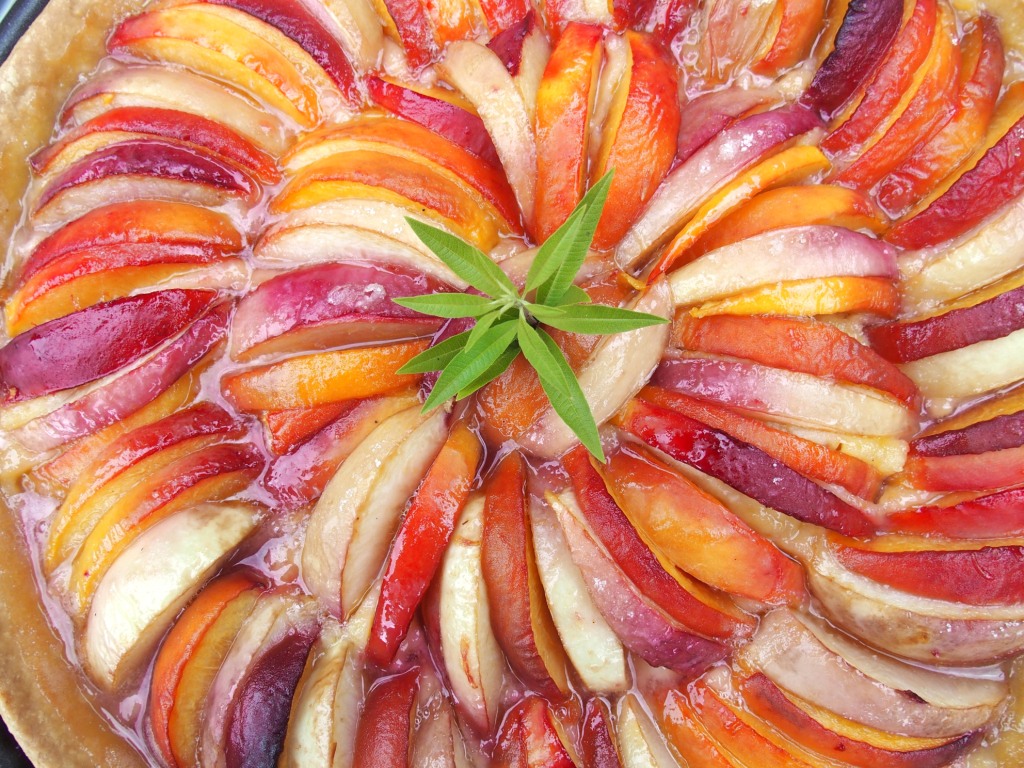 C’est une simple tarte aux fruits mais qui en a fait soupirer de contentement plus d’un. « Une explosion de saveurs ! » (dixit un aficionado reconnaissant) et pour cause : des fruits mûrs à point, des amandes et des citrons parfumés. Une tarte-rayon de soleil, un condensé d’été, LE dessert de vacances par excellence à déguster au jardin un jour de grand beau temps (ou pour se consoler des averses…).