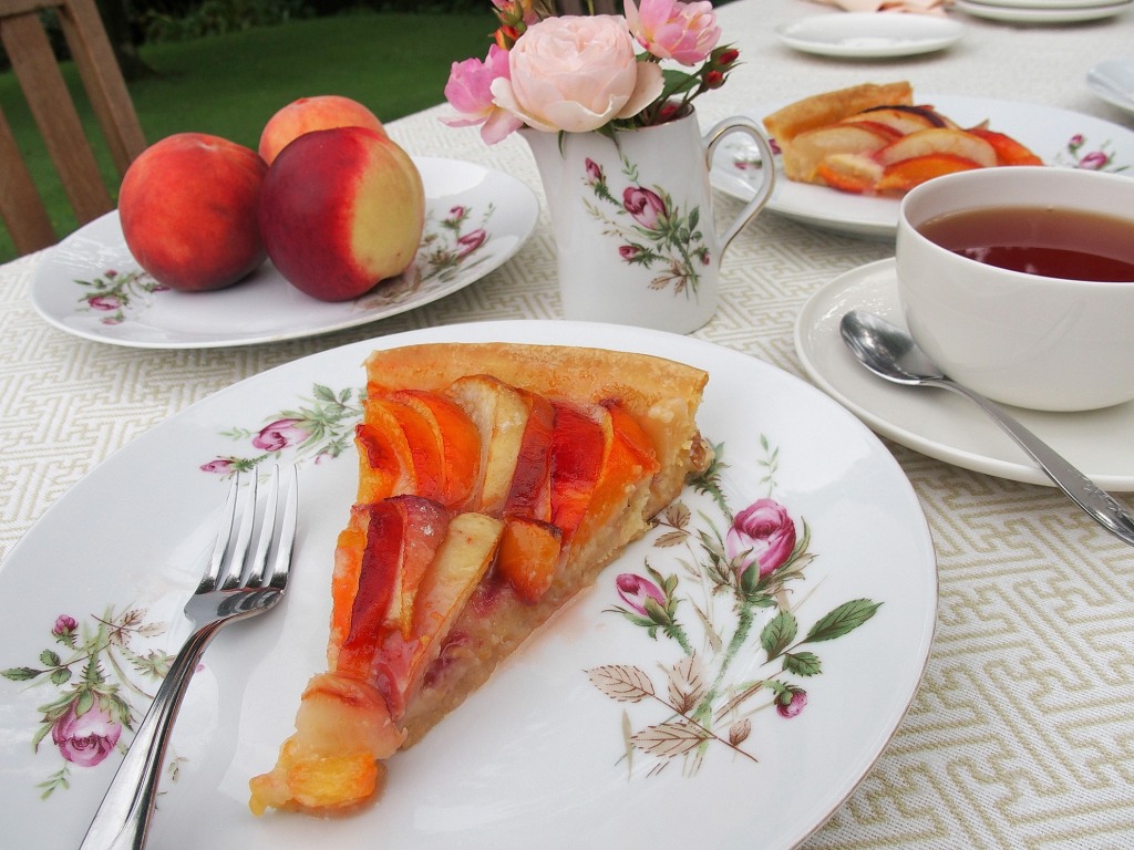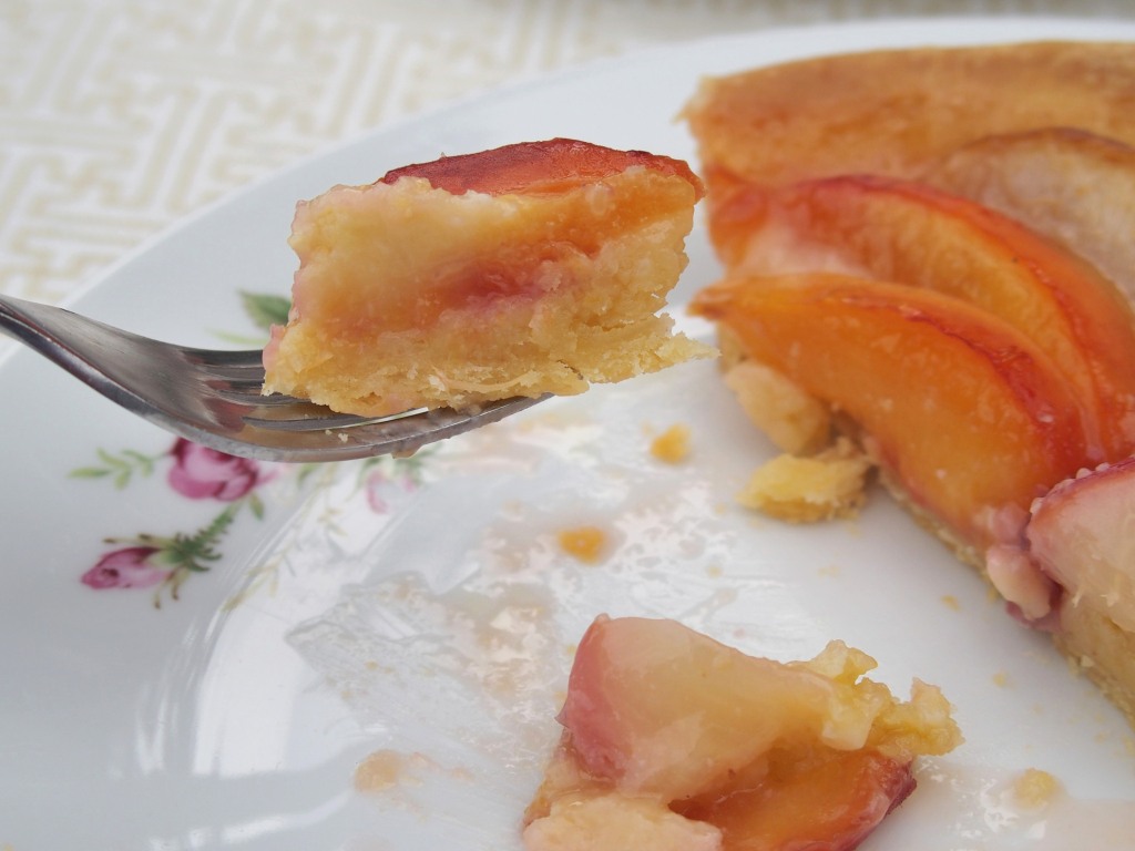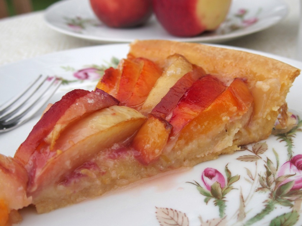 J‘aime les rituels sucrés qui rythment l’année et nous rappellent, beaucoup mieux que le calendrier, l’enchaînement des saisons : tarte aux mirabelles en automne, gâteau aux pommes, sablés à la cannelle et chocolat chaud en hiver … mais bon, nous n’en sommes pas encore là ! Pour l’heure, c’est encore l’été – enfin, par intermittence, car le nord s’obstine cette année à ressembler à sa caricature de contrée polaire noyée sous la pluie – et je peux encore et encore régaler les gourmands avec ma tarte pêches-brugnons.
