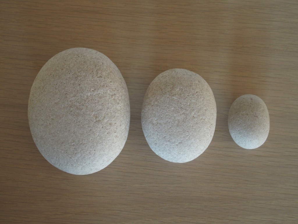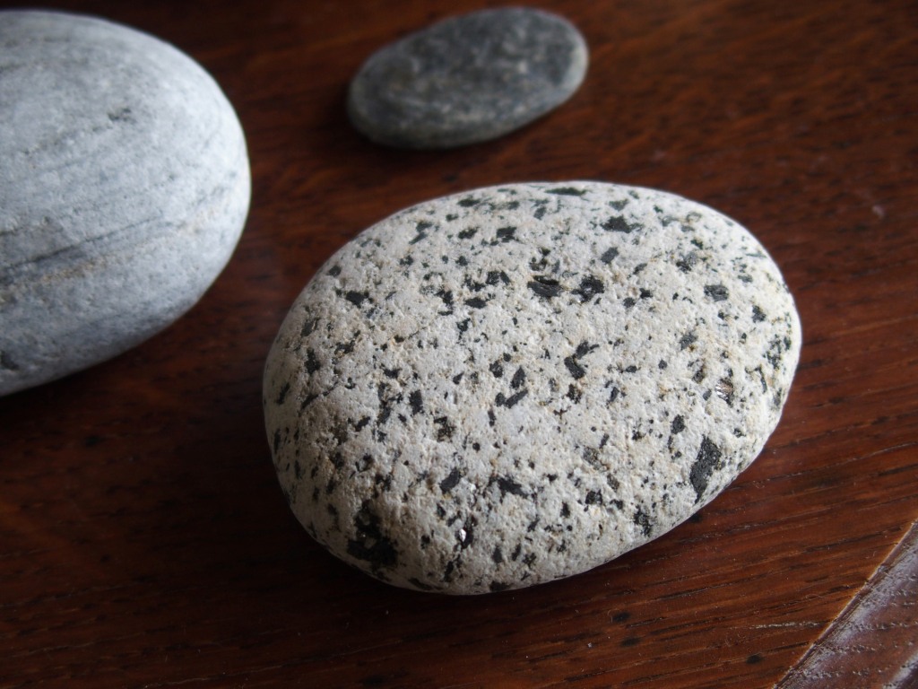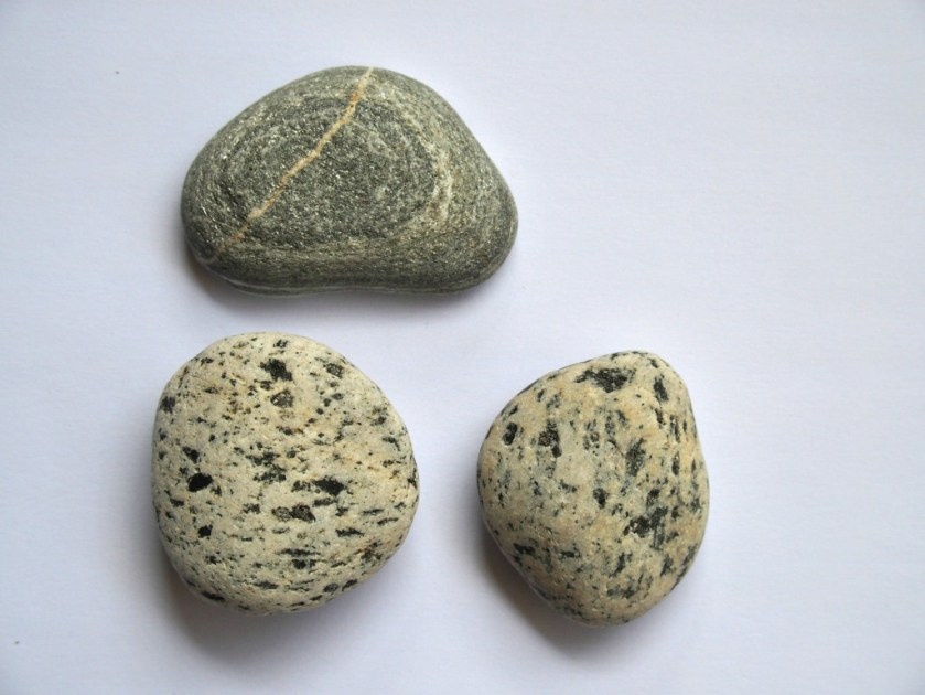 Ces trois galets proviennent de la pointe de Sagres (ou cap Saint Vincent, à l’extrême sud-ouest de l’Europe) au Portugal. Ce sont mes préférés. Les tenir dans la paume de la main est un bonheur absolu.