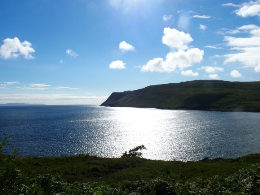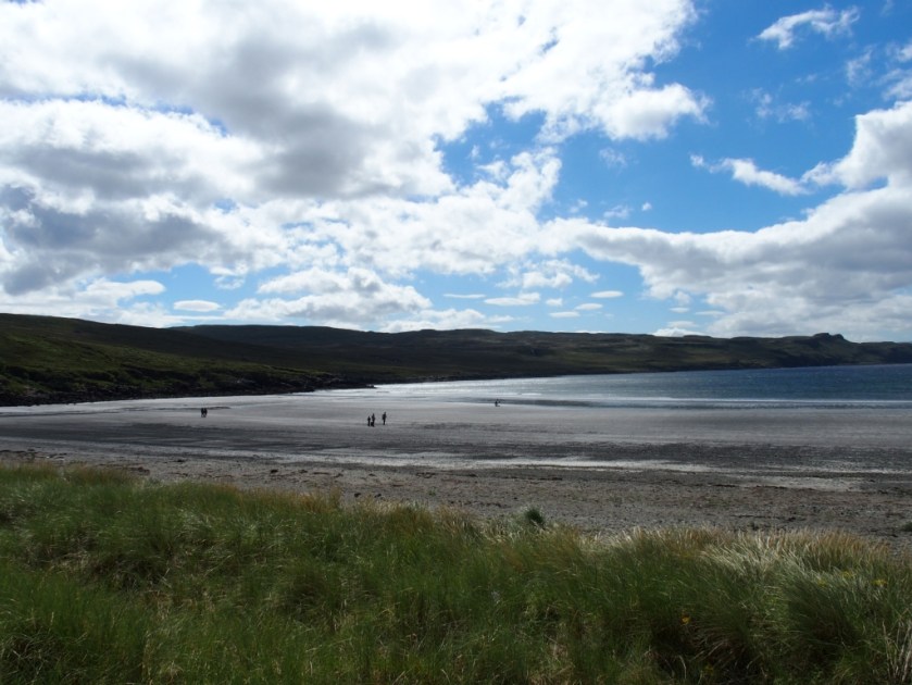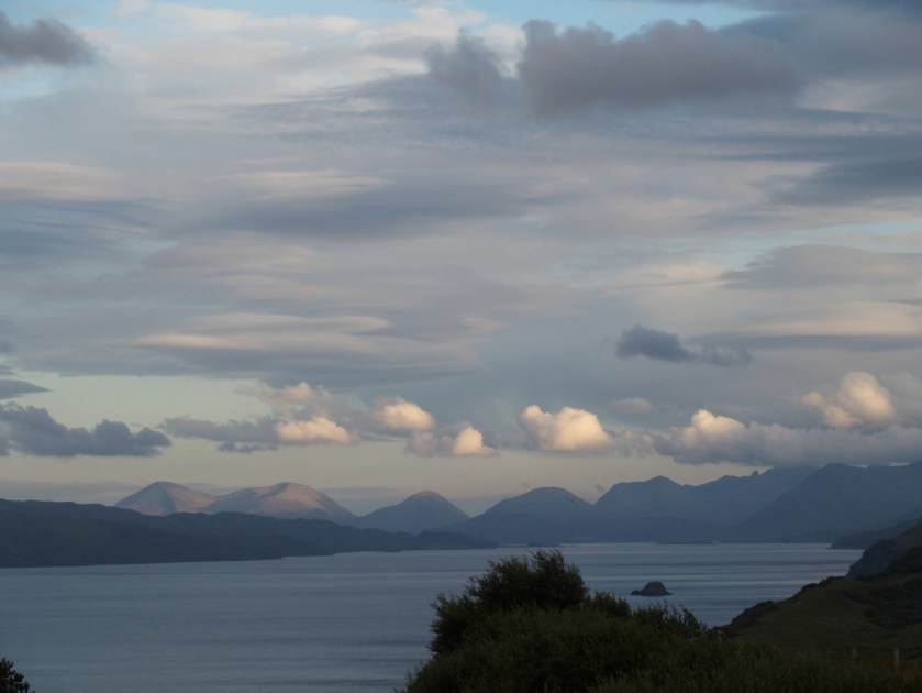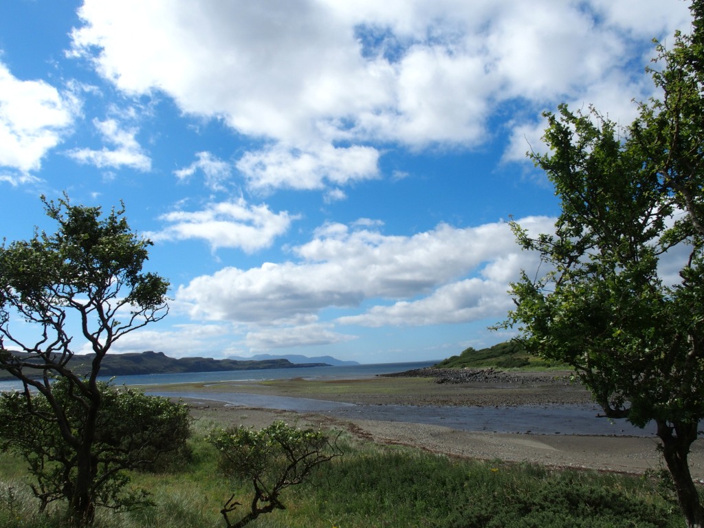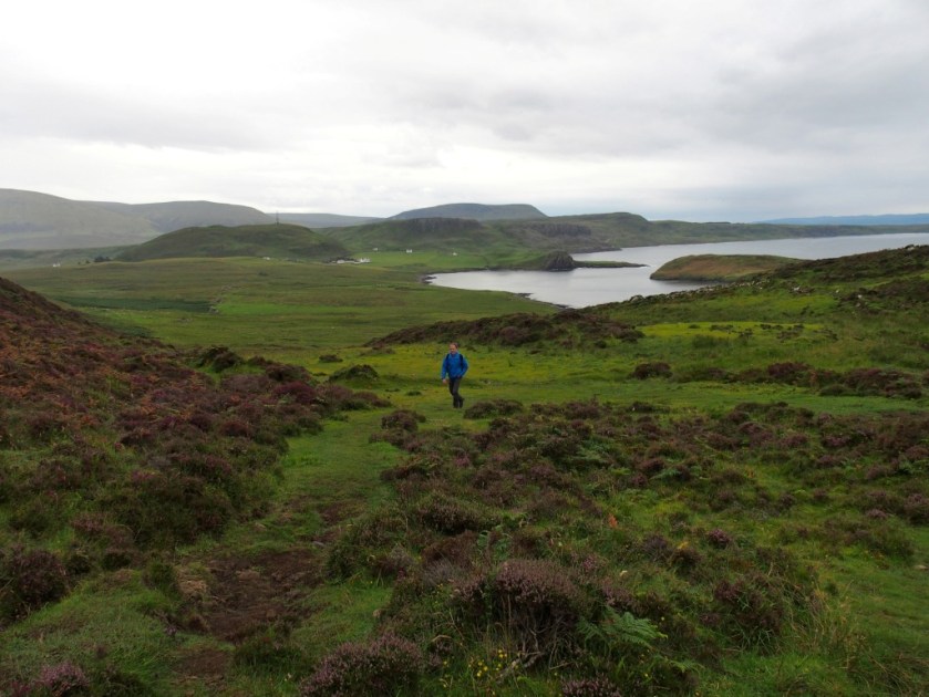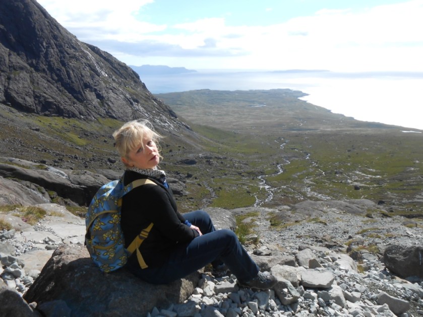 Une fois n’est pas coutume. Virginie M. apparaît sur la photo (pestant quelque peu d’être prise en photo …). Mais le plus intéressant est d’apercevoir en contrebas le loch Brittle et les îles d’Eigg et de Rum à l’horizon.