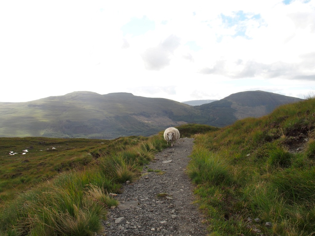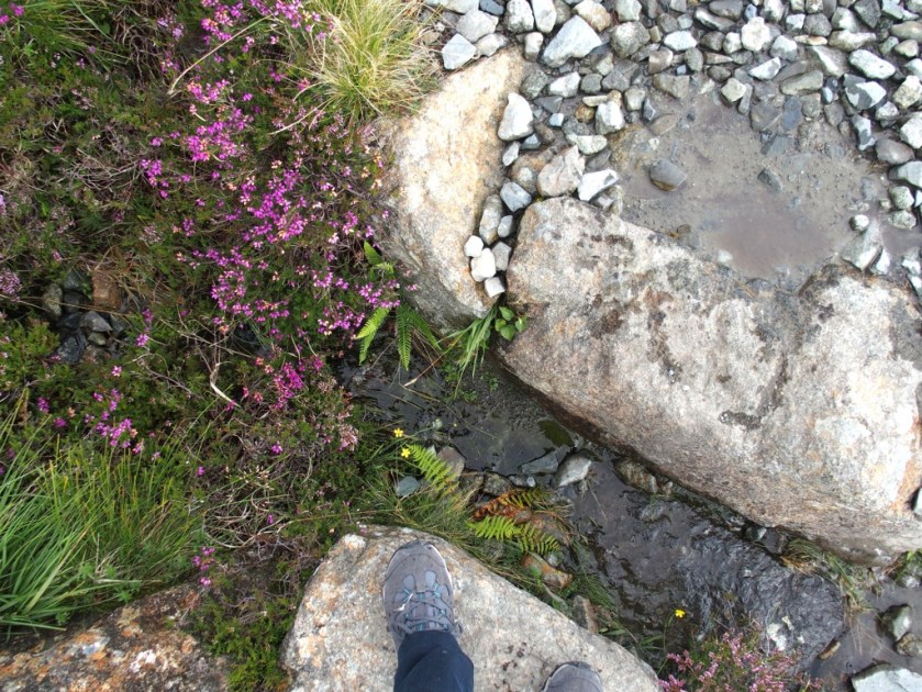 Comme très souvent, les sentiers deviennent de simples traces puis se perdent dans la lande tourbeuse. « Very boggy in places » signalait très souvent Walking Higlands (le site de référence pour la randonnée en Ecosse) dans le descriptif de ses circuits. Eh bien oui, je vous confirme que parfois, c’était très boggy boggy. La tourbe gorgée d’eau est certes souple sous le pied mais mieux vaut avoir de bonnes chaussures de marche parfaitement étanches.