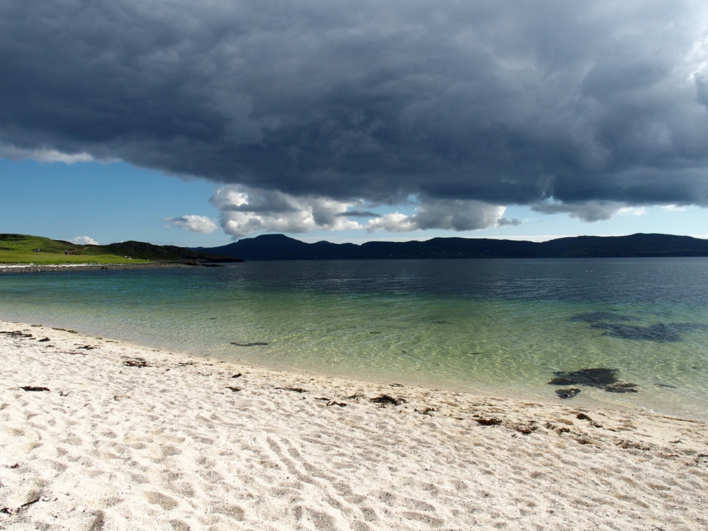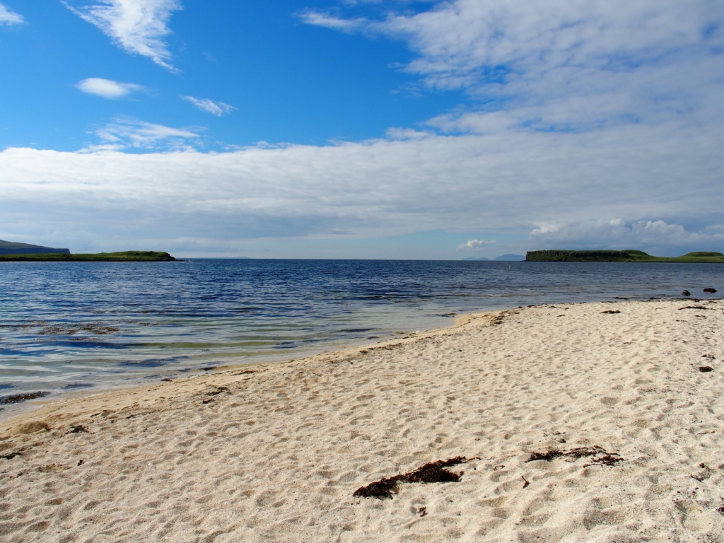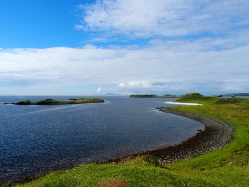 Coral Beach, sur la rive du loch Dunvegan, est l’une des curiosités incontournables de l’île. Je m’attendais donc à être légèrement déçue. Mais bon, je voulais voir, quand même … Nous avons garé la voiture au bout d’une route en cul de sac, emprunté le chemin sableux et tourbeux qui y mène. J’ai marché, impatiente malgré tout puis j’ai presque couru quand, depuis le sommet d’une colline, je l’ai aperçue, étincelante et irréelle sur le bleu indigo de la baie. Une merveille inattendue. Une féérie.