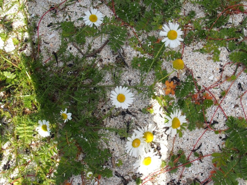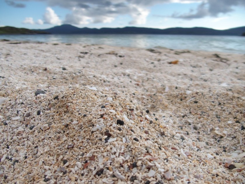[Le « sable » de cette plage est en fait constitué de petits débris calcifiés d’une algue -Lithotamnium corrallioides – (maërl), de fragments coquillages et de sable]