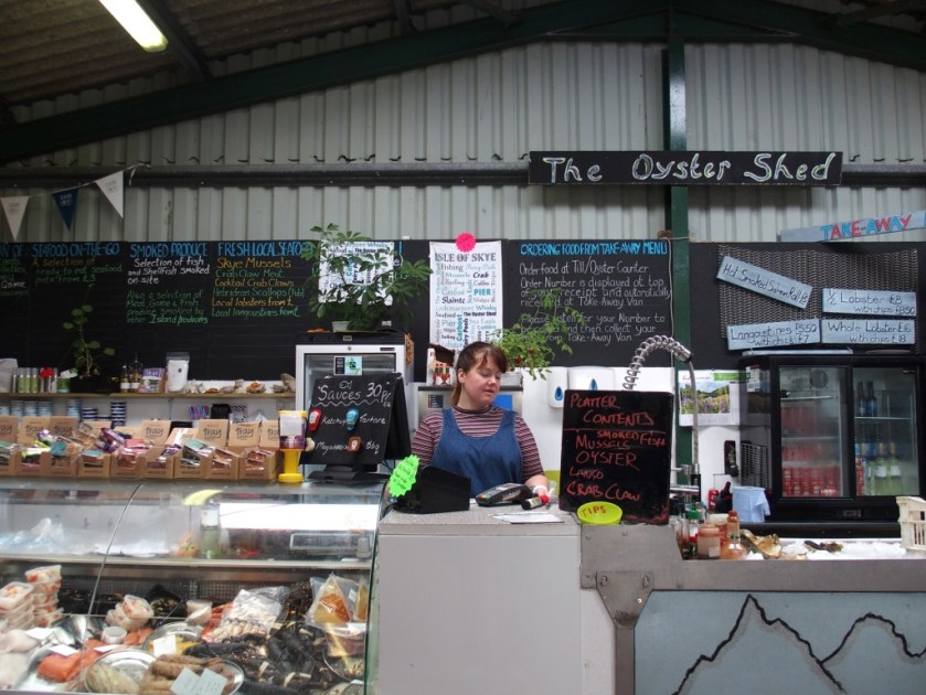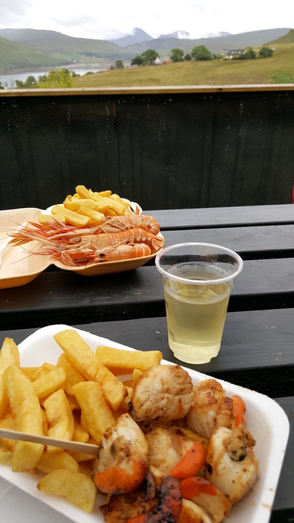 A l’est de Talisker Bay, dans le petit village de Carbost, nous avons dégusté les meilleures coquilles Saint-Jacques du monde (pour un prix défiant tout concurrence : 10 livres, soit environ 12 euros pour 8 noix de Saint-Jacques d’une qualité exceptionnelle). The Oyster Shed, outre une production d’huitres, propose crabes, langoustes, moules, langoustines des Hébrides sans oublier le saumon ; le tout directement de la mer à l’assiette. On peut y déjeuner sur place, sur des tables de bois brut, en contemplant les nuages au dessus du loch Harport.