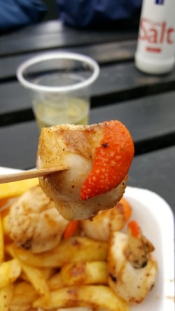 Admirez la taille généreuse de ces Saint-Jacques servies avec un beurre à l’ail et de grosses pommes-frites (alliance locale étonnante mais finalement délicieuse).