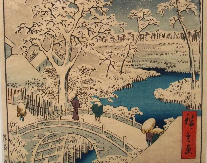 Dimanche dernier, un froid bleu engourdissait Bruxelles. L’herbe des parcs était toute givrée et les flaques d’eau ressemblaient à de petits lacs gelés. La magie de décembre enveloppait la ville et, tandis que Monsieur Bruxelles faisait filer la voiture dans les artères désertes (ah ! Bruxelles le dimanche !), je plissais les yeux de bonheur sous le soleil d’hiver, bien au chaud dans les plumes de ma doudoune. J’étais bien. Je me délectais simplement du moment présent, me laissant béatement hypnotiser par le défilé des maisons, le dégradé du ciel, le scintillement des rails du tramway sur les pavés ou la petite silhouette d’un merle furtivement apparue et disparue … Toute la ville semblait flotter, irréelle, merveilleuse, comme transformée par la baguette de quelque fée ou le souffle d’un Esprit de l’hiver. Nous filions vers le Japon … ou, plus précisément, vers l’exposition Ukiyo-e – les plus belles estampes japonaises au musée du Cinquantenaire. Après une petite demi-heure de traversée citadine, nous avons franchi les arcades du Cinquantenaire sous les chevaux du quadrige du Brabant – d’un …