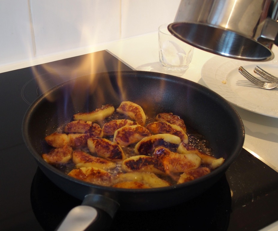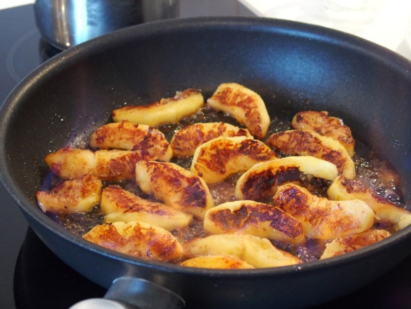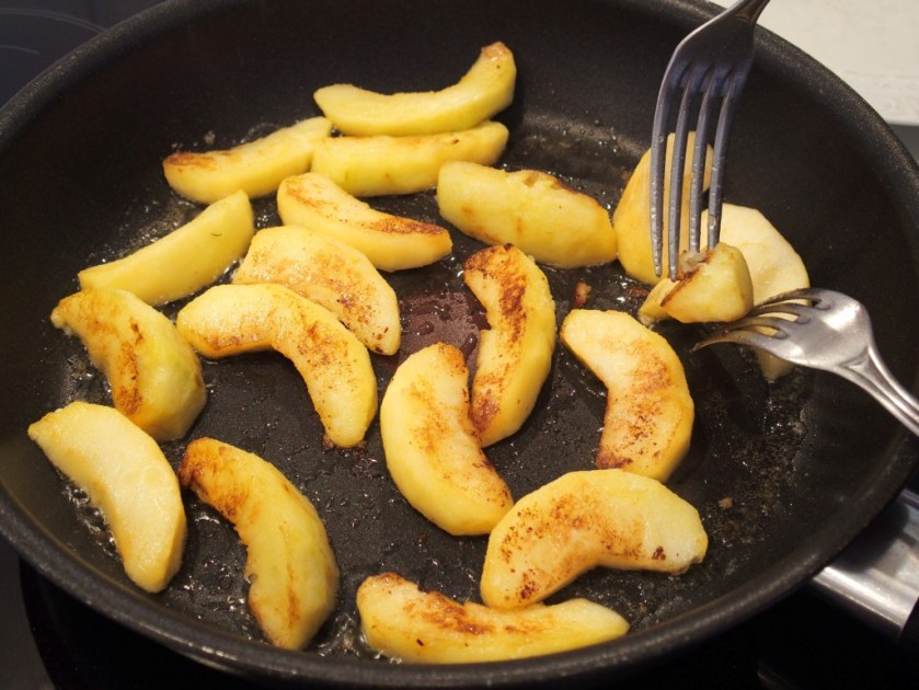 Lorsque les quartiers de pomme sont fondants, bien dorés et légèrement caramélisés, couper le feu et les flamber au Calvados (à ce stade, si vous êtes encore de grands enfants, vous pouvez éteindre la lumière et pousser – mentalement ou pas – des cris de joie en contemplant les petites flammes bleues et jaunes du calvados en train de flamber).