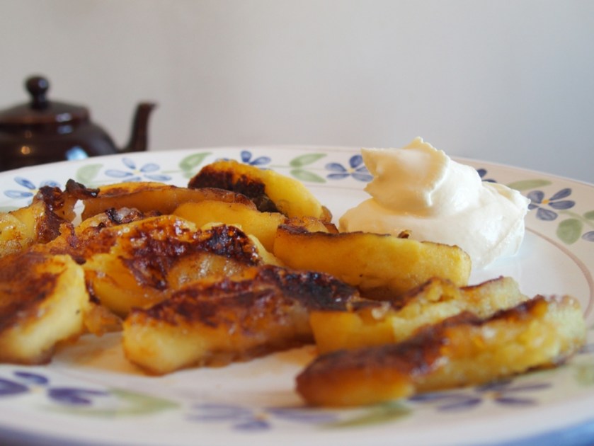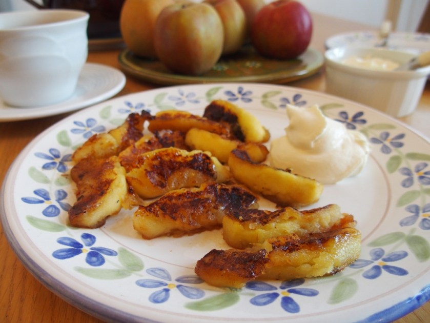 Dresser vos quartiers de pommes sur de jolies assiettes et les servir accompagnés d’une grosse cuillerée de crème fraiche épaisse bien froide.