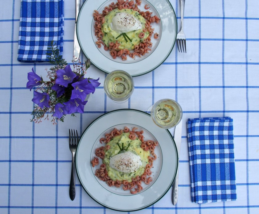 Smeus ou pommes de terre et crevettes grises à la mode belge … Encore une recette belge me direz-vous ? Oui, mais j’aurais quelques scrupules à ne pas la partager tant ce plat est un délice. C’est mon monsieur, archétype du Belge gourmand (mais néanmoins gourmet), friand de frites, de bière trappiste, de filet américain* et de crevettes grises qui me le fit découvrir il y a maintenant quelques années. Un soir, arrivant à Bruxelles directement du travail, c’est-à-dire exténuée et affamée, je le trouvais installé à la table de la cuisine devant une montagne de crevettes qu’il décortiquait une à une, patiemment, et avec une dextérité qui ne pouvait être que le fruit d’une longue expérience et d’un apprentissage précoce – chez sa grand-mère à Knokke-le-Zoute m’expliqua-t-il où on les dégustait au petit déjeuner avec des tartines de beurre salé. Le chat surveillait l’opération assis sur une chaise, le museau sur la table, stoïque. Je fis comme lui, piochant quand même deux crevettes, une pour le félin, une pour moi, afin que nous en …