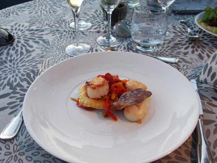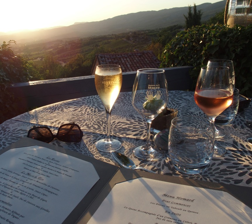 Nous nous sommes installés à notre table (effectivement, la meilleure), avons soupiré d’aise, détaillé le menu (que choisir ? Tout semblait délicieux) puis chaussé nos lunettes de soleil pour contempler le coucher du soleil en dégustant un verre de très bon rosé (Domaine de Fondrèche) pour Monsieur Bruxelles et un cocktail champagne-pêche de vigne pour moi. Nous n’avions pas besoin de parler. Les transparences roses et dorées de nos verres s’accordaient aux couleurs du ciel, la chaleur était tombée et seules les hirondelles et les murmures feutrés des autres dîneurs troublaient le calme. Moment parfait.