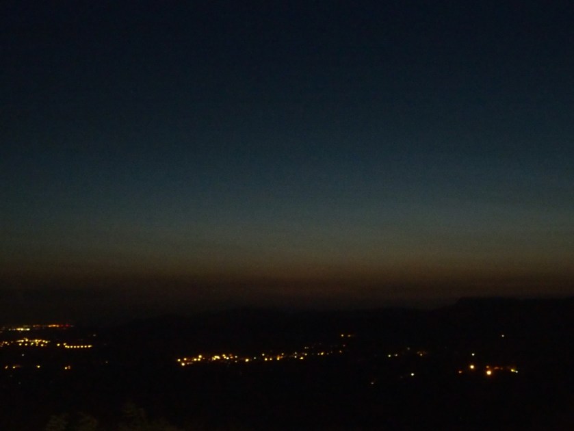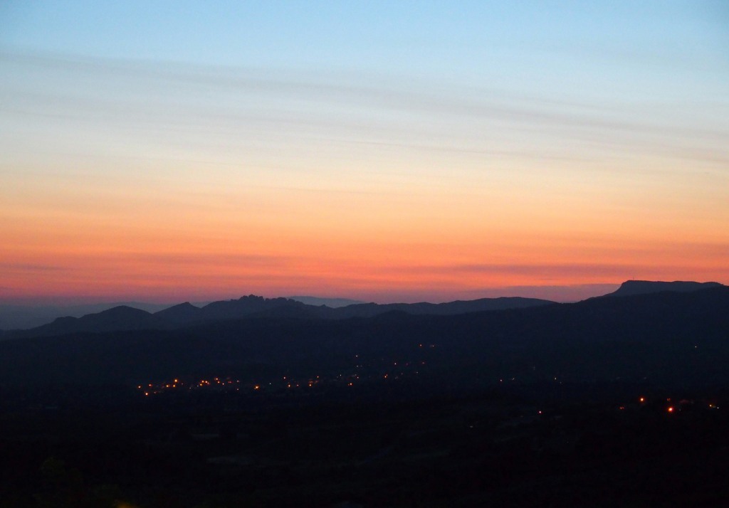 Parfait également le dîner : Saint-Jacques en feuilleté aux poivrons confits, duo d’agneau (carré rôti en croûte et son pavé de gigot) accompagné d’un risotto d’épeautre et d’une crème légère à l’ail puis tarte aux pêches, le tout arrosé de Ventoux blanc puis rouge (toujours du Domaine de Fondrèche, absolument excellent) et café noir comme la nuit qui nous enveloppait maintenant, accompagné de calissons, guimauves et chocolats … Nous étions fin prêts, repus et détendus pour notre ascension nocturne du Ventoux et notre rendez-vous avec la voie lactée …