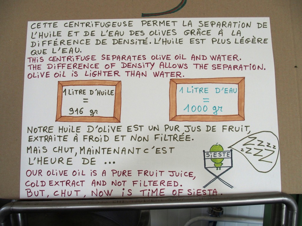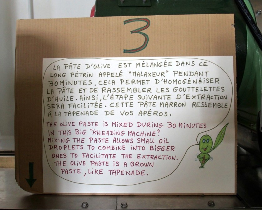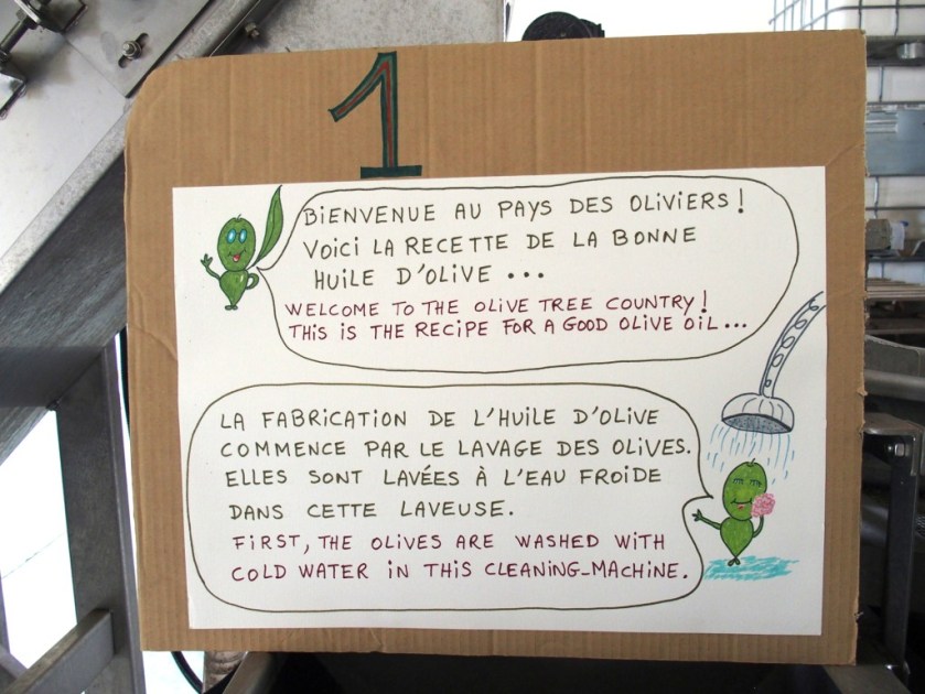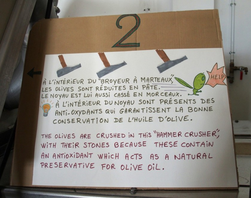 Si vous passez au Moulin Jullien, vous découvrirez les adorables dessins de Chantal Jullien. Elle possède un vrai talent d’illustratrice et a réalisé les panneaux explicatifs accompagnant la visite de l’atelier – j’adore son olive stylisée ! – ainsi que les étiquettes de son « miel du pays bleu » et des bouteilles d’huile d’olive – et ça, je l’apprécie tous les jours dans ma cuisine.