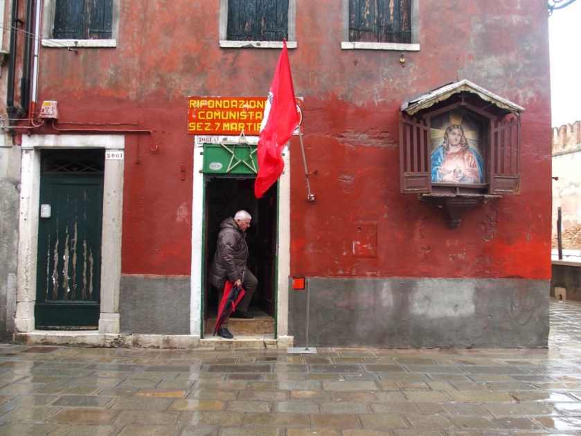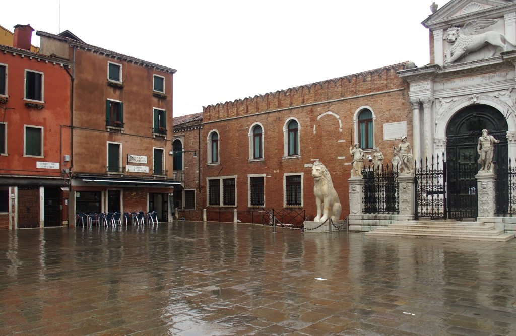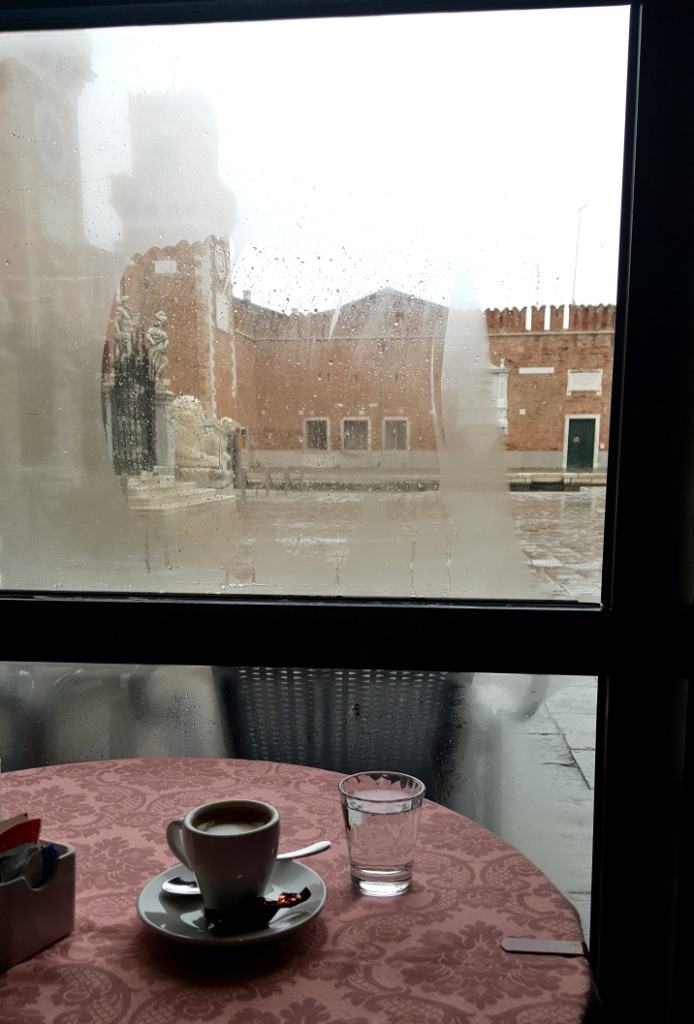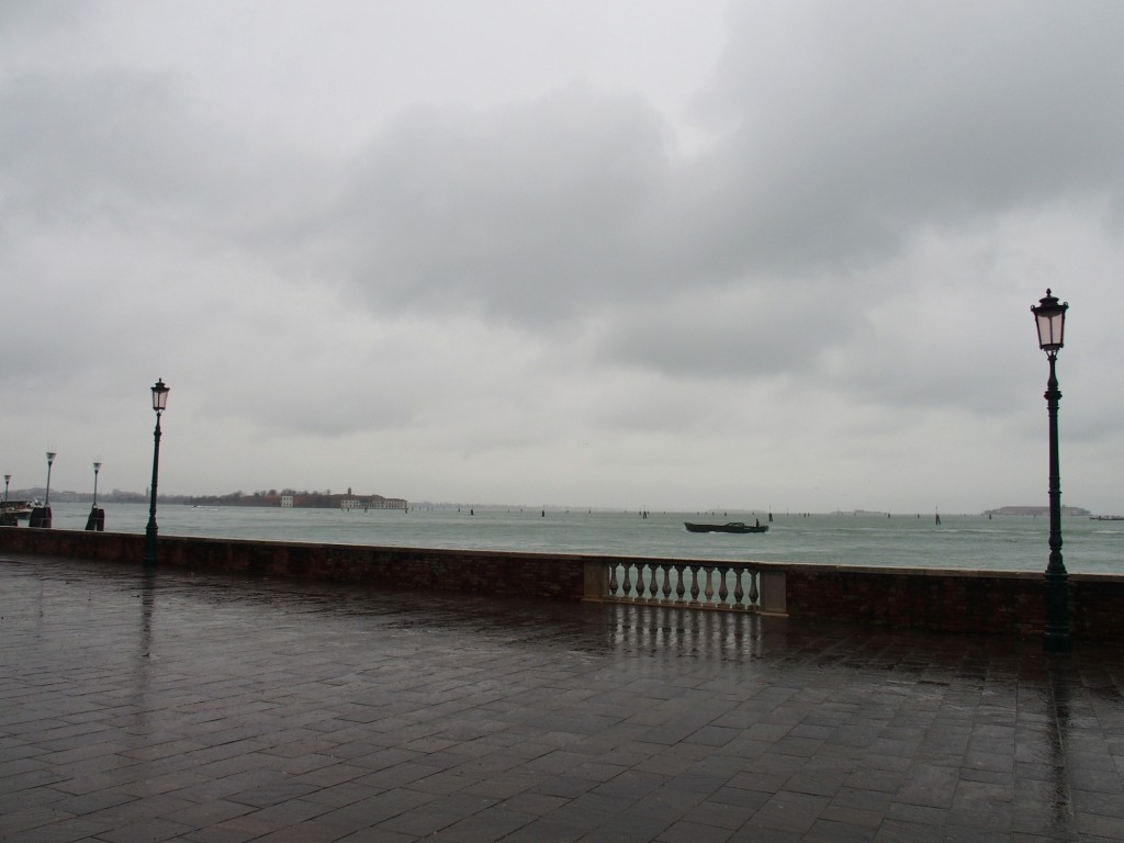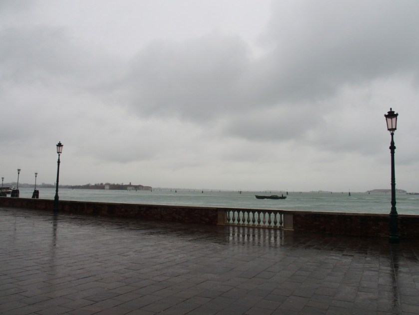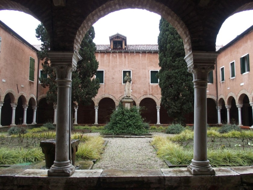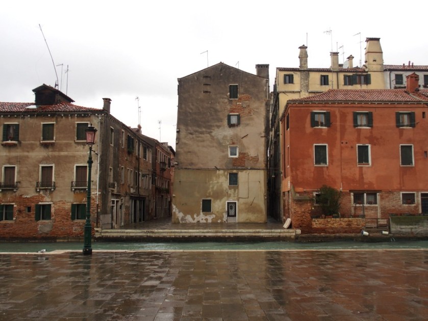 Venise est un labyrinthe. Je me suis donc perdue, ai demandé mon chemin à plusieurs reprises, n’ai fait aucune photo (trop de pluie, trop de vent) et suis finalement arrivée sur le campo San Francesco. Très étrange avec ses colonnades ocres et blanches.