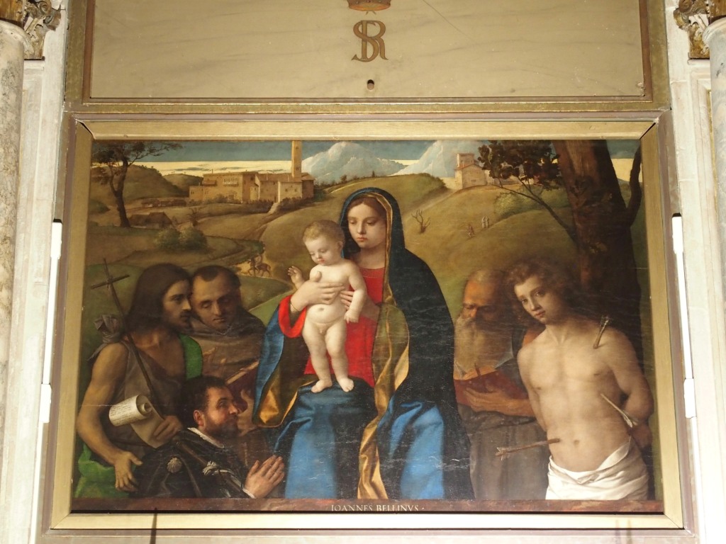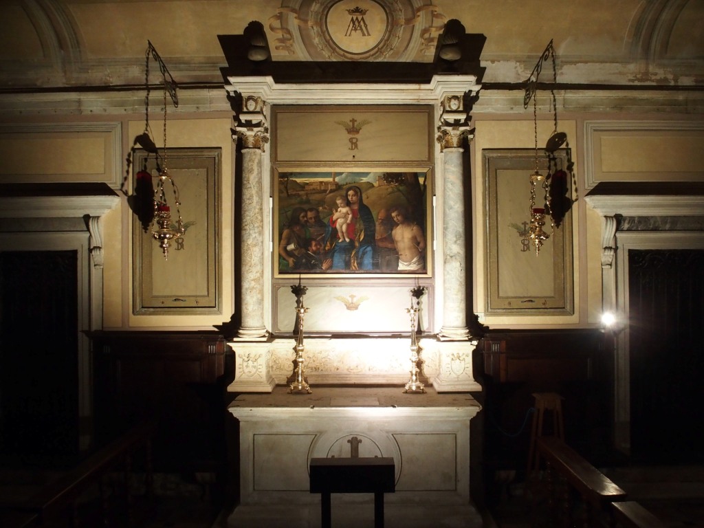 Dans l’église, personne, hormis un prêtre qui m’indiqua où se trouvait le Bellini. J’empruntais un couloir sombre dont l’une des portes vitrées donnait sur un cloître puis je pénétrais dans une chapelle en contrebas, tout aussi sombre. Il me fallut m’habituer à la pénombre avant de distinguer la minuterie permettant, moyennant quelques euros, d’éclairer la toile.