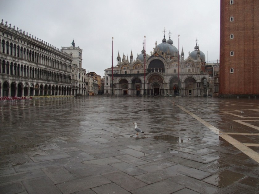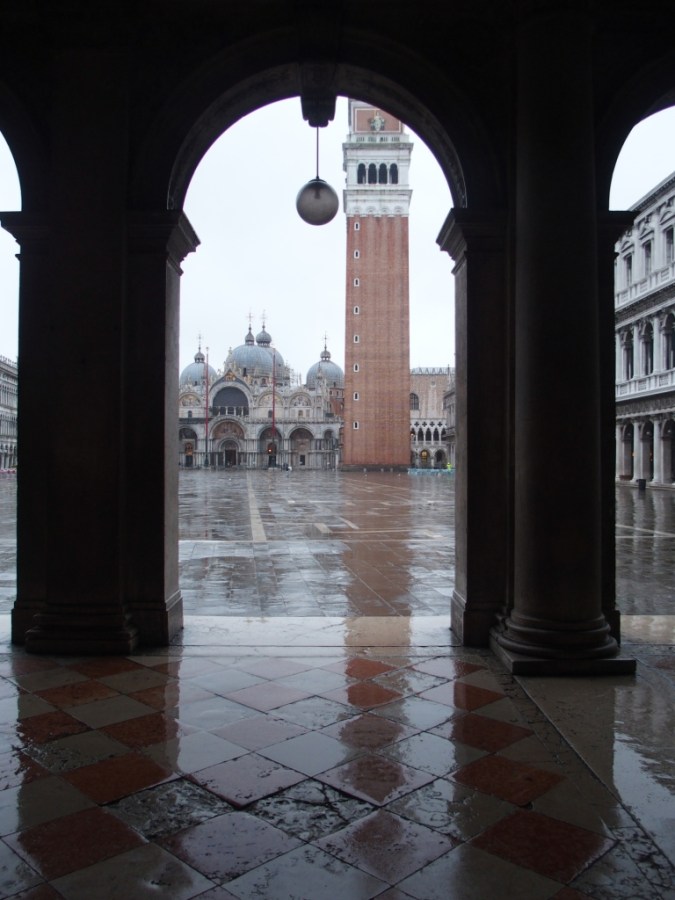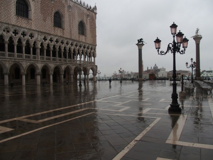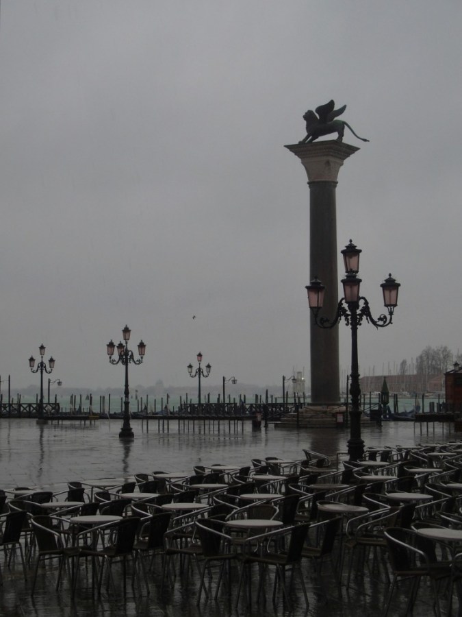 La pluie tombait toujours, mêlée maintenant à des cristaux de neige. Un balayeur traversait la place, petit point jaune citron dans le gris du matin. Seules les gouttes d’eau se faisaient entendre et de grandes flaques, comme autant de miroirs, s’étaient formées, reflétant la basilique et le ciel ; je pensais à Diane qui, avant mon départ, m’avais dit : « ce n’est pas grave s’il pleut car à Venise même les flaques d’eau sont belles !… ». Et elle avait raison ! Comme toujours.