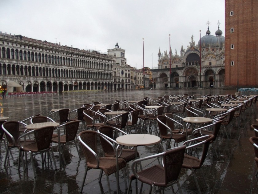 Je me levais donc et ouvris les volets sur la nuit. La pluie était glacée et je constatais en frissonnant que le sol de la terrasse s’était transformé en une petite mare, une acqua alta venue du ciel en quelque sorte. Vite habillée, sans même prendre le temps d’un thé, je quittais ma chambre et passais devant la réceptionniste médusée qui me lança un buongiorno interrogateur. Pourquoi diable, devait-elle se dire, affronter la pluie de si bon matin alors que les croissants fourrés et le jus d’oranges fraichement pressées attendaient les clients dans la salle feutrée du petit-déjeuner ?