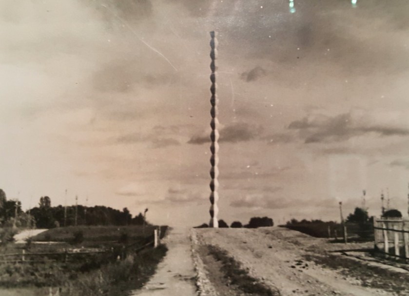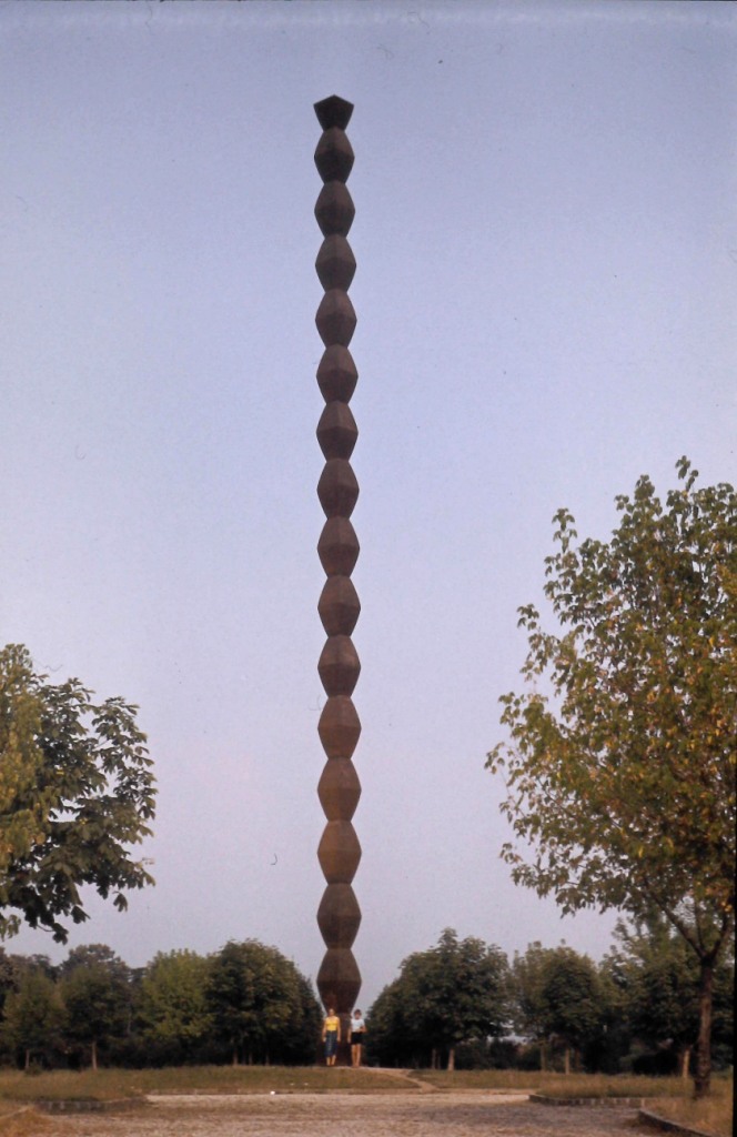 À l’époque Tîrgu Jiu*, la ville d’Olténie où se trouvent trois des chefs-d’œuvre de Brancusi, était relativement peu étendue et assez désolée. J’ai le souvenir de maisons grises, de poussière et d’un parc à la pelouse râpée. La Roumanie des villes pouvait être, il est vrai, assez déprimante. Cependant, là, se trouvaient la Colonne de l’infini, la Porte du baiser et la Table du silence. Et il n’y avait personne. Juste quelques roumains désœuvrés mais aucun touriste. Et cela fût une chance que de pouvoir découvrir de telles œuvres dans les meilleures conditions qui soient ; c’est-à-dire, de les vivre vraiment : passer sous la Porte du baiser, s’asseoir tous les quatre à la Table du silence, y passer un long moment et surtout, se planter à la base de la Colonne de l’infini ou Colonne sans fin qui semble bel et bien soutenir le ciel et s’y perdre. J’étais peut-être un peu trop jeune et prenant l’art, comme il venait (ce qui revient à le vivre et ce qui est finalement très bien) mais je garde le souvenir précis de cet instant, de cette sculpture comme un trésor au fin fond d’un parc presque oublié.