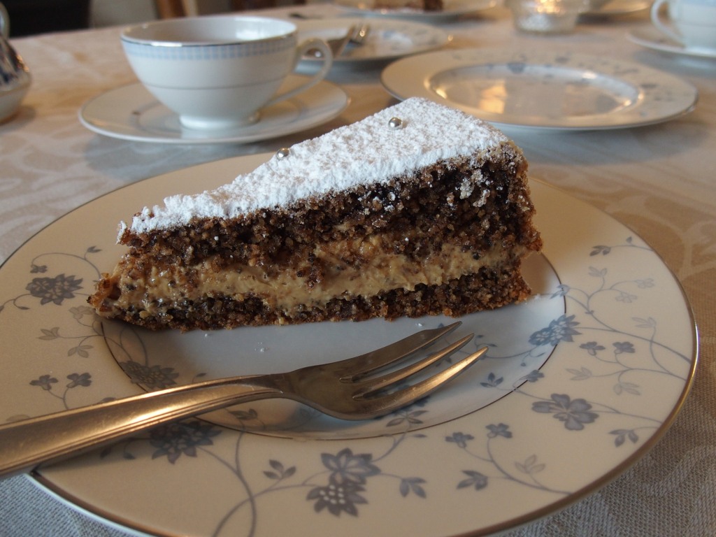 J’aime le servir en plein hiver (car c’est un gâteau « riche » : les noix, le rhum, la crème …) saupoudré d’une belle couche de sucre glace rappelant la neige, le givre et le froid. Et pour que l’évocation soit parfaite, décoré de la façon la plus minimale qui soit (mais aussi, je trouve la plus chic) en disposant sur toute sa surface de simples petites perles de sucre argentées. Ce qui fit dire un jour à l’un de mes convives, alors que j’apportai fièrement mon gâteau à table : « Oh ! Des plombs de chasse ! ».