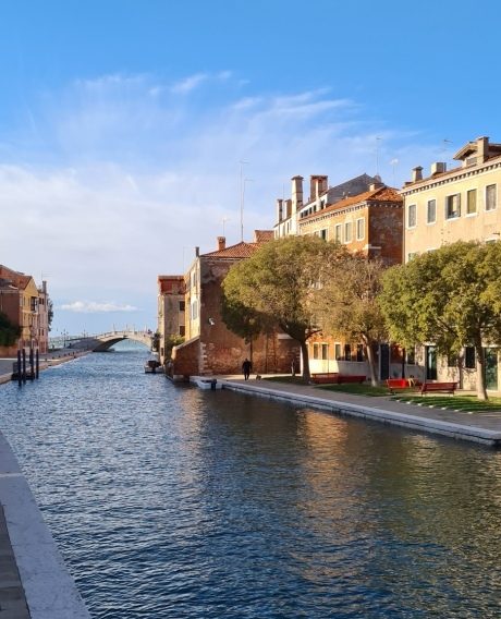 Il faisait magnifiquement beau et calme. Seul le bruit de l’eau coulant de la fontaine près des bancs rouges parvenait jusqu’à moi. Je décidais de me faire un thé mais me ravisais. J’avais envie de croissants aux amandes encore tièdes et surtout de sortir très vite, de renouer avec mes habitudes matinales, de reprendre ma balade rituelle. La boulangerie était un prétexte. Je fus donc dehors en moins de trois minutes et c’est là finalement, au moment où je franchissais le pont de l’arsenal qu’eurent lieu mes vraies retrouvailles avec Venise. Une brise légère ridait la surface de l’eau, l’air était frais, la lumière à la fois froide et dorée, une lumière de matin d’automne, et le ciel d’un bleu lavé plein de promesses. Ce fut un éblouissement, une évidence. Je me souviens d’ailleurs n’avoir pu réprimer un rire de bonheur et m’être dit que c’était beau, que tout était là, que je comprenais pourquoi j’étais revenue, pourquoi j’aimais tant cette ville, ce « haut lieu de la religion de la beauté ». Là sur ce pont de l’arsenal – également si bien nommé ponte del paradiso -, ça commençait bien …