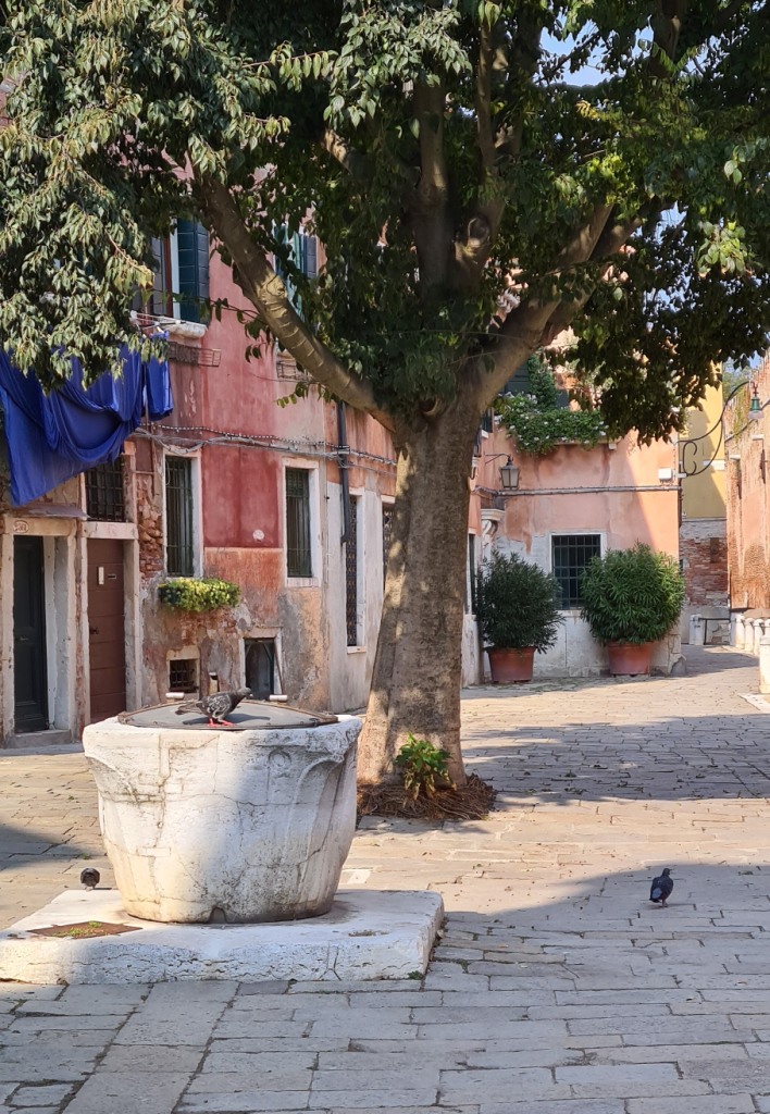 Ce n’est toutefois que le lendemain que je retrouvais vraiment Venise. Car tout est affaire d’état d’esprit et même d’état physique. Et en ce dimanche matin, réveillée tôt et ravie de constater que le soleil entrait par l’une des fenêtres dont j’avais laissé les volets ouverts, je me sentais parfaitement bien. Je trainais un peu au lit, les yeux fixés sur les poutres du plafond, laissant mon esprit vagabonder. Qui habitait ici auparavant ? Je me suis toujours posé la question lorsque j’ai été amenée à séjourner dans de vieilles bâtisses, persuadée que les lieux gardent la mémoire de leurs occupants et des évènements heureux ou malheureux dont ils furent témoins. J’en ai d’ailleurs fait l’expérience dans les combles d’un château qui m’a vu les fuir tant l’atmosphère y était lourde d’évènements à n’en pas douter douloureux, ce dont j’eus ensuite la confirmation. Pour ce qui est de mon appartement, j’avais lu que la calle della Pegola où il se trouve devait son nom aux pegoloti qui calfeutraient les fissures des navires du temps où l’arsenal tout proche pouvait produire une galère en une seule journée. Certains d’entre eux avaient donc peut-être vécu dans la maison où je me trouvais. Il n’en restait cependant nulle trace. En revanche, je savais que les reflets sur l’eau vert céladon, le ciel bleu frais par-dessus le mur d’enceinte de l’arsenal, il l’avaient vu, l’avaient perçu, s’en étaient peut-être délectés comme je le faisais à cet instant. Un lien sensible, comme ce rayon de soleil par la fenêtre que j’avais maintenant ouverte…