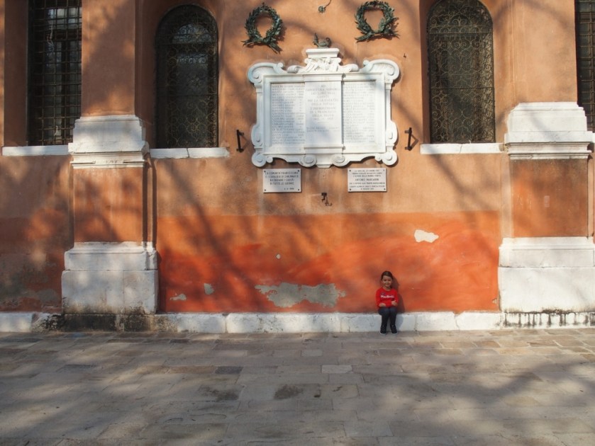 Cette scène aurait-elle la même saveur dans une autre ville ? Je ne le pense pas. A Venise l’art est partout et les scènes les plus banales prennent une dimension cinématographique sans d’ailleurs que les acteurs en soient conscients. C’est cela qui est beau. Comme ces trois ouvriers cassant la croûte au pied de la façade de l’église de San Francesco della Vigna. Assis côte à côte en rang d’oignon, ils discutaient entre deux bouchées et deux gorgées de bière. Le chef d’œuvre de Palladio au pied duquel ils se trouvaient, ils n’en avaient sûrement que faire et c’était très bien. Tout comme cette petite fille que je croisais un jour sur le côté de cette même église. Elle jouait à courir entre le haut mur ocre rouge de l’édifice et le canal tout proche puis s’était assise elle aussi contre le mur, essoufflée par sa course. Pull rouge sur mur rouge, les genoux dans les mains et le regard espiègle. Je lui avais souri, demandé si je pouvais la photographier ce qu’elle avait accepté avec un grand hochement de tête. Elle aussi, de Palladio, elle n’en avait que faire. Elle jouait et c’était très bien. Tant que l’on vivra à Venise comme dans n’importe quelle ville, Venise vivra …