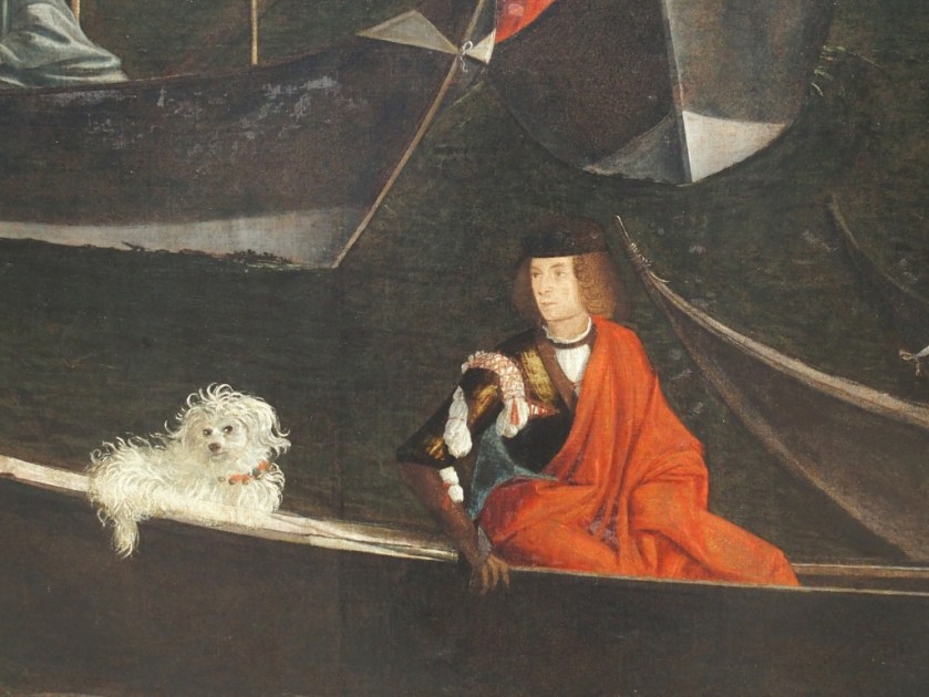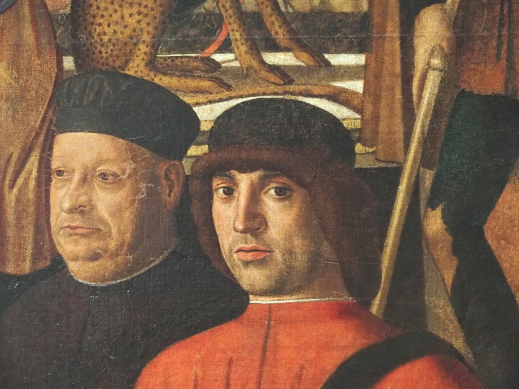 Quant aux visages, ils disent beaucoup. Et là encore le peintre décide, s’amuse parfois, j’en suis persuadée, et nous montre les gens, tels qu’ils sont, tels qu’ils étaient – fussent-ils simple anonyme devant le pont du Rialto dans Le Miracle de la relique de la Croix de Carpaccio ou membre d’une confrérie religieuse dont la procession a été immortalisée par Bellini ; des gens d’alors, et pourtant si semblables à nous… Mêmes visages dans la foule, dans le lointain ou presque cachés, mêmes expressions trahissant les mêmes pensées : l’ennui, l’amusement, la résignation … Et cela marche aussi dans l’autre sens. Il suffit de regarder les visages d’aujourd’hui pour s’apercevoir que rien ne change, que les visages restent les mêmes. A Venise, vous croisez bien souvent de jeunes hommes minces, boucles brunes et œil de velours, tout droit sortis d’une peinture de Bellini ou de Carpaccio. En Flandre, ce sont ces jeunes femmes à la peau très claire et aux cheveux d’un blond pâle qui semblent s’être échappées d’une peinture. Des Memling, oui des Memling, à vélo certes, et en jean, sneakers aux pieds et portable à l’oreille, mais si semblables aux filles de la famille Moreel …