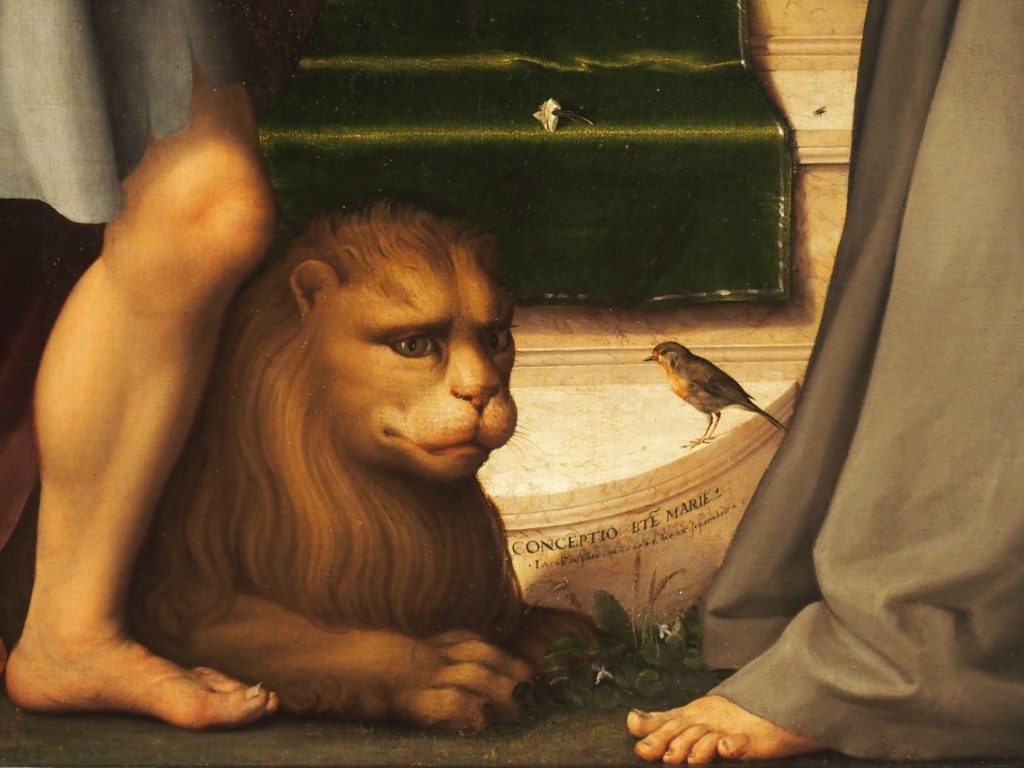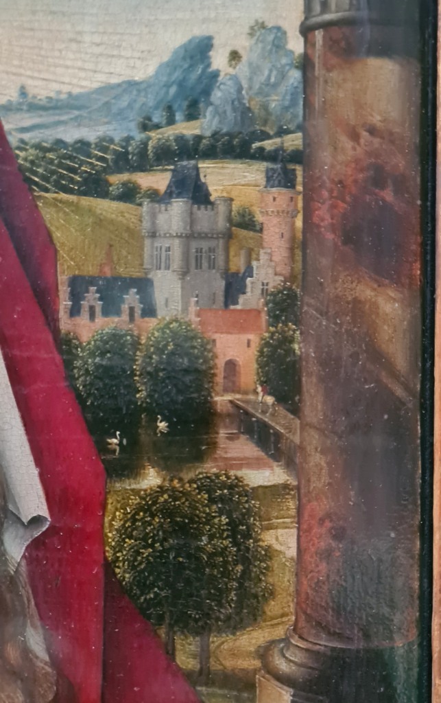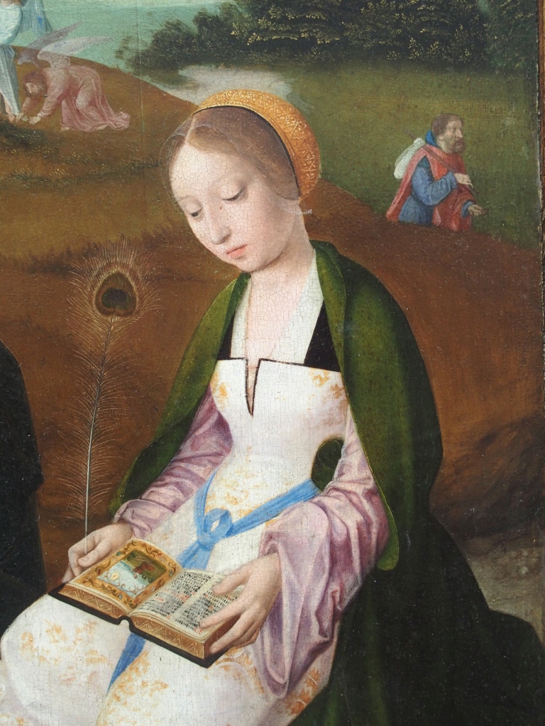 Les détails, fabuleux indices, clins d’œil, témoignages de la vie d’alors, messages envoyés par le peintre à travers les siècles … ils me fascinent. Souvent peu visibles, ils sont pourtant bien là. La photographie, lorsqu’elle n’est pas mise en scène, capte bien souvent le hasard et les détails, pouvant alors échapper au photographe derrière son viseur, ne seront révélés que lors du tirage … Le peintre, lui, décide de tout ; du coléoptère sur le revers d’une feuille d’iris, de cygnes dans le lointain d’un paysage flamand, de fleurs de trèfles sous les sandales d’un saint …