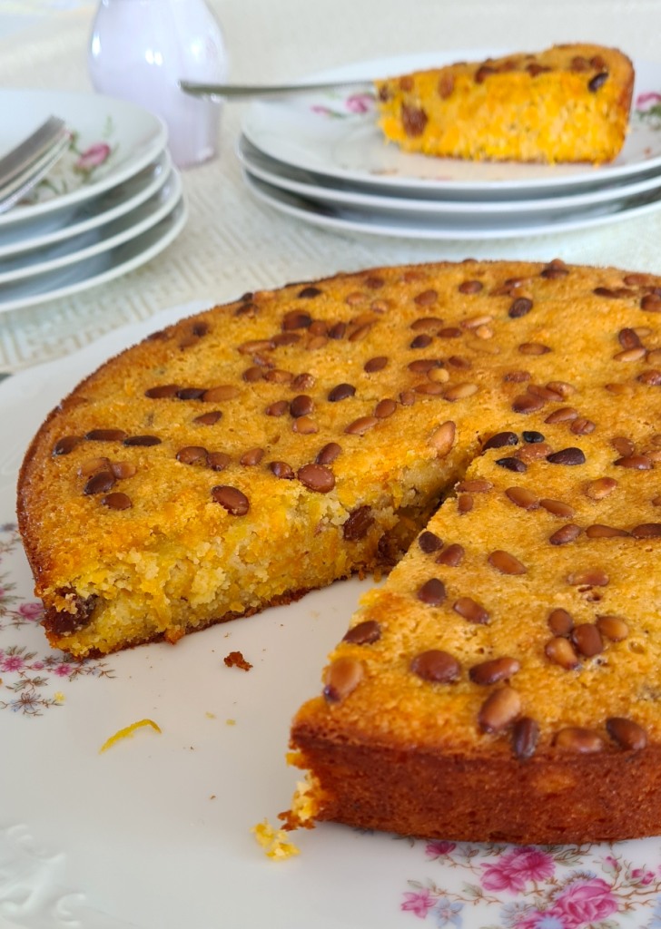 Mettre l’appareil dans un moule à manqué antiadhésif de 23 cm de diamètre (graisser le moule avec de l’huile d’olive, en essuyant l’excédent avec un essuie-tout). Egaliser la surface de la pâte et répartir sur le dessus les pignons torréfiés. Enfourner et laisser cuire 30 à 40 mn. Surveiller la fin de la cuisson. Une lame de couteau enfoncée au centre du gâteau doit ressortir sèche. Si en fin de cuisson le gâteau se colorait trop fort, le couvrir d’une feuille d’aluminium. Sortir le gâteau du four et attendre environ 10 mn avant de le démouler sur une grille à pâtisserie pour le laisser refroidir. Dès que le gâteau est froid le transférer sur le plat de service.