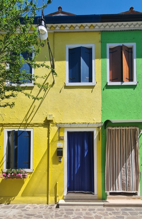 Arrivée à Burano, je choisi d’éviter les ruelles les plus touristiques et d’en explorer d’abord la périphérie – si l’on peut dire, tant cette île est petite –, là où les couleurs des maisons sont parfois un peu délavées et la peinture écaillée. Les portières de toile jaune citron ou bleu vif se gonflent sous le vent, et bougainvillées et plumbago grimpent le long des murs. Pas un chat, il est encore tôt dans l’après-midi. Silence de village Cycladique.
