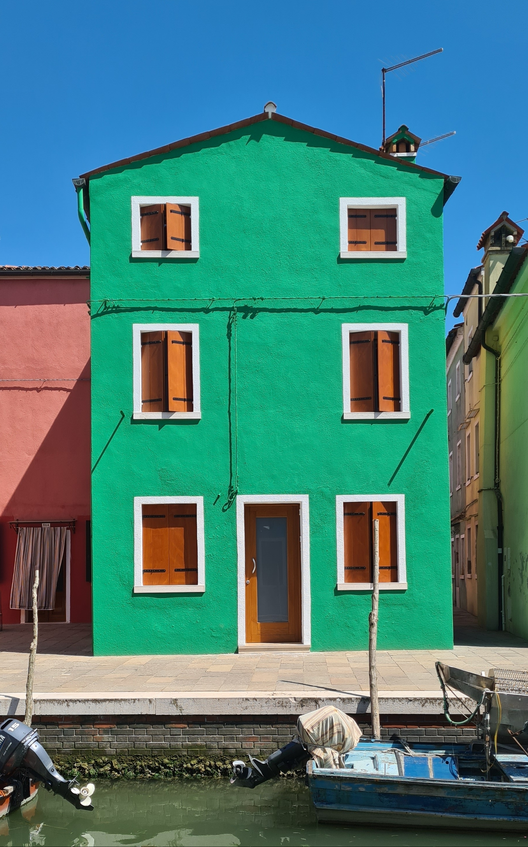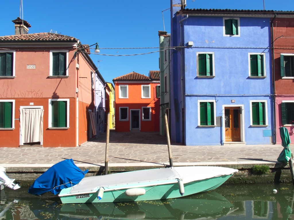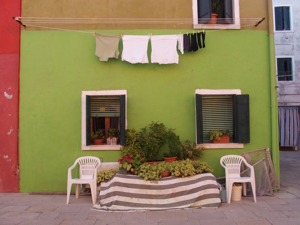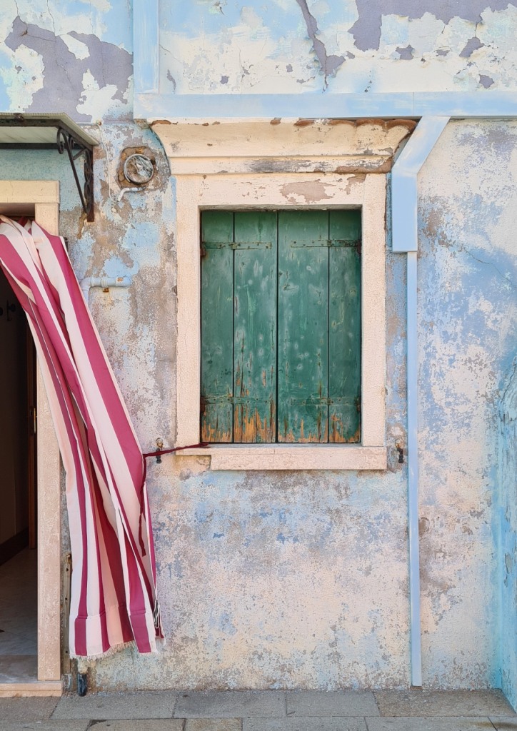 Plus loin, les couleurs des maisons claquent et explosent. C’est beau mais, là où les touristes affluent, un peu trop repeint à mon goût, trop neuf, trop impeccable. Il faut alors s’éloigner, emprunter les ruelles perpendiculaires, traverser l’île de part en part et s’apercevoir que la couleur est partout et fait véritablement partie de Burano mais d’une manière moins factice. Les plus petites maisons des plus petites ruelles, celles cachées au fond d’une impasse ou face à la lagune là où aucun touriste ne passe, arborent des couleurs de bonbons, vert pistache, fuchsia, jaune citron ou en gardent les traces, magenta évanoui, outremer délavé. Et c’est cela qui est beau et montre que la ville est bien vivante : la juxtaposition du neuf et du décrépi, du pimpant et de l’abandon des couleurs au passage du temps. Les quelques ruelles qui semblent destinées presque uniquement aux touristes (et où l’on trouve d’ailleurs les inévitables boutiques de dentelle et de biscuits), ne sont finalement qu’une part infime de l’île, un décor léché que l’on expose pour pouvoir vivre tranquillement derrière la carte-postale.