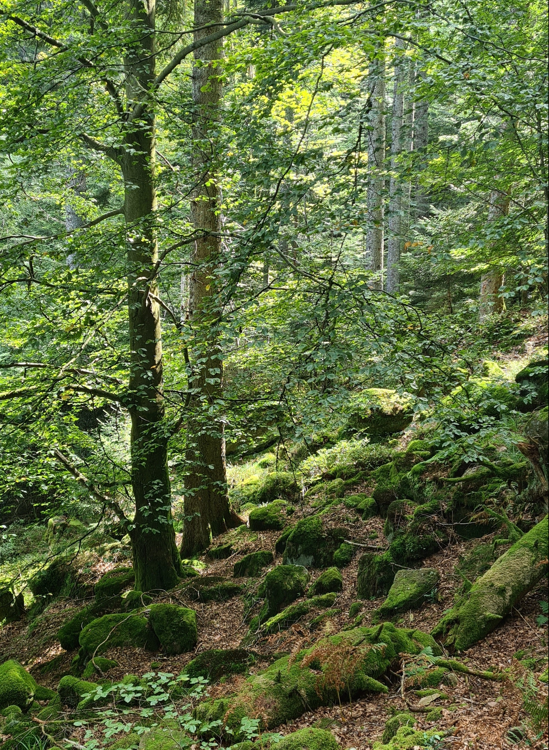 François marche devant moi. Il aime à ouvrir la marche, cela doit être ancré au plus profond de son cerveau reptilien, souvenir des premiers hommes pour qui la forêt était synonyme de menace. Le mâle, j’imagine, devait alors tenter de repousser mammouths et aurochs, voire les trucider pour protéger les femelles et, en passant, trouver de quoi se vêtir et faire un barbecue … Nous ne rencontrons malheureusement ni loup, ni lynx. Pourtant, les lynx sont de retour dans les Vosges tout comme le loup dont l’un d’entre-eux fût aperçu il y a quelques années dans le massif du Donon. Cela dit, que ces bêtes restent invisibles, tapies au fond des bois, tranquilles loin des hommes. Car tous ne sont pas des amis de la nature et des animaux. Je pense à ce conducteur de quad déboulant à toute vitesse sur un chemin menant au lac de la Maix, debout sur son engin d’enfer, ne se souciant ni des randonneurs qui durent faire un bond pour l’éviter ni des quelques chiens qui les accompagnaient et frôlèrent l’arrêt cardiaque. Finalement, même dans la forêt la bêtise trouve sa place et revêt parfois des formes plus comiques. Toujours sur l’un des chemins menant au lac de la Maix – le seul endroit où nous avons croisé d’autres promeneurs car l’accès peut se faire en voiture – je dus réprimer un fou rire en apercevant un petit groupe de femmes toutes pieds nus. Tenue de sport mais pieds nus ! J’ai beau savoir que la forêt est à la mode et que fleurissent les stages pour apprendre à embrasser les arbres ou prendre des « bains de forêt », voir de mes yeux un tel groupe de gogos me laissa pantoise. Je leur souhaitais bien du plaisir à marcher sur les aiguilles de pin et les cailloux. Même les hommes préhistoriques devaient se confectionner des chaussons de peau de mammouth, non ? Cela est comique mais en même temps un peu triste. Comme ils sont nombreux en effet ces malheureux privés dans leur enfance d’un apprentissage sensible du monde alentour et qui, ne sachant ni regarder ni ressentir se ruent vers de telles expériences. Mais après-tout, pourquoi pas, ils ne font de mal à personne et doivent y trouver du plaisir … Pour ma part, j’ai toujours caressé les arbres, je les écoute aussi en collant mon oreille contre leurs troncs, je mange les bourgeons de sapin et les jeunes feuilles de charme. Mais ça, depuis l’enfance.