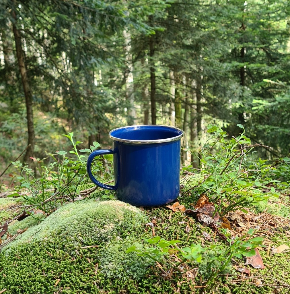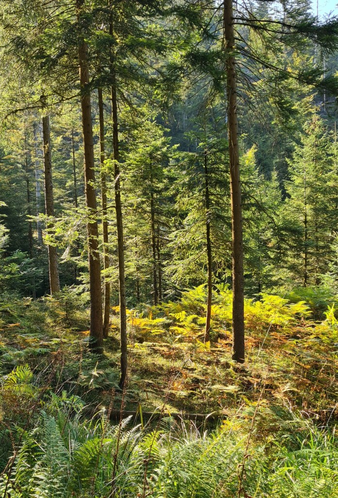 Ce matin nous étions partis un peu tard, traînant devant nos tasses de thé et le kouglof acheté la veille à la boulangerie du village. J’avais, comme à mon habitude, étudié mes cartes au 25 millième, traçant le parcours de notre balade : boucle de 12 kms – dénivelé positif : 450 m, dénivelé négatif : 362 m – rien de sportif, juste de la balade et surtout du temps laissé aux pauses déjeuner et thé de l’après-midi. Manger dans la nature est l’un de mes plus grands plaisir, qu’il pleuve ou qu’il fasse grand beau temps et je n’échangerais pour rien au monde nos déjeuners forestiers contre une table gastronomique. D’ailleurs, nos casse-croûtes le sont à leur façon, gastronomiques : pain au levain, sublimes rillettes de canard, cornichons à l’aigre-douce, tomates-cerises mûres à point, munster fermier, raisin muscat, bière blonde pour François et Earl Grey brûlant pour moi. D’ailleurs, il faut nous voir tous les matins dans la petite cuisine du chalet, préparant notre déjeuner avec une attention de grand chef car, tant qu’à pique-niquer, autant que tout soit très bon. Il faut toujours ajouter du plaisir au plaisir.