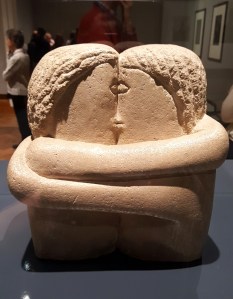 Alors en ce jour d’automne à Bruxelles, je fus déçue, forcément. La proximité avec les œuvres n’était pas possible. D’une part en raison de la foule qui dès le matin déambulait en filmant et en photographiant (les gens ne savent plus regarder ni d’ailleurs, je le constatais avec étonnement, tourner autour des sculptures) mais également du choix du commissaire d’associer les œuvres de Brancusi à celles de ses amis artistes de l’époque : Fernand Léger, Man Ray, Amedeo Modigliani. Ceci, bien sûr, pour nous faire comprendre, replacer dans le contexte, faire des parallèles … et ainsi mâcher tout le travail pour un public d’endormis qui ne fera plus d’effort (l’effort de lire, de comprendre, de s’intéresser vraiment). Non, il faut du « tout cuit » et des animations (danse, concerts et j’en passe) afin d’attirer les foules. Que leur restera-t-il de Brancusi ? Pas grand-chose, je le crains. Et puis, les groupes, mon dieu, les groupes ! Agglutinés comme des poissons en bancs serrés et … les audioguides ! La calamité des audioguides qui fait s’arrêter pile poil devant vous des vieilles parlant fort à leur voisine (audioguide à l’oreille oblige) ou des ados goguenards et pressés d’en finir qui n’écoutent rien mais vous bloquent la vue tout à leur séance de selfies.