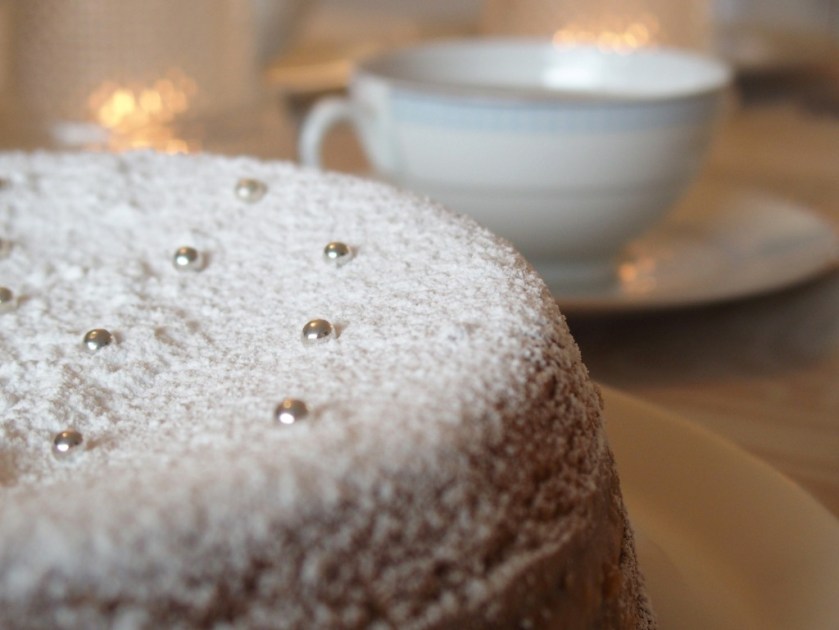 J’aime le servir en plein hiver (car c’est un gâteau « riche » : les noix, le rhum, la crème …) saupoudré d’une belle couche de sucre glace rappelant la neige, le givre et le froid. Et pour que l’évocation soit parfaite, décoré de la façon la plus minimale qui soit (mais aussi, je trouve la plus chic) en disposant sur toute sa surface de simples petites perles de sucre argentées. Ce qui fit dire un jour à l’un de mes convives, alors que j’apportai fièrement mon gâteau à table : « Oh ! Des plombs de chasse ! ».